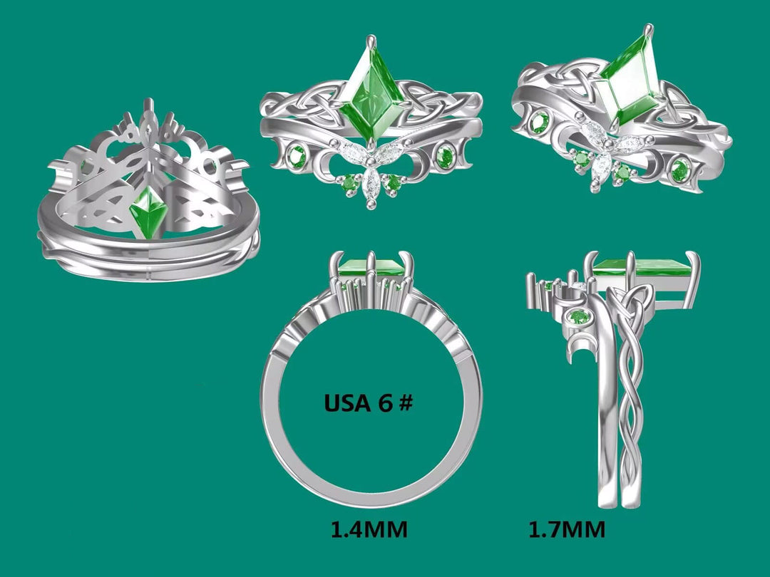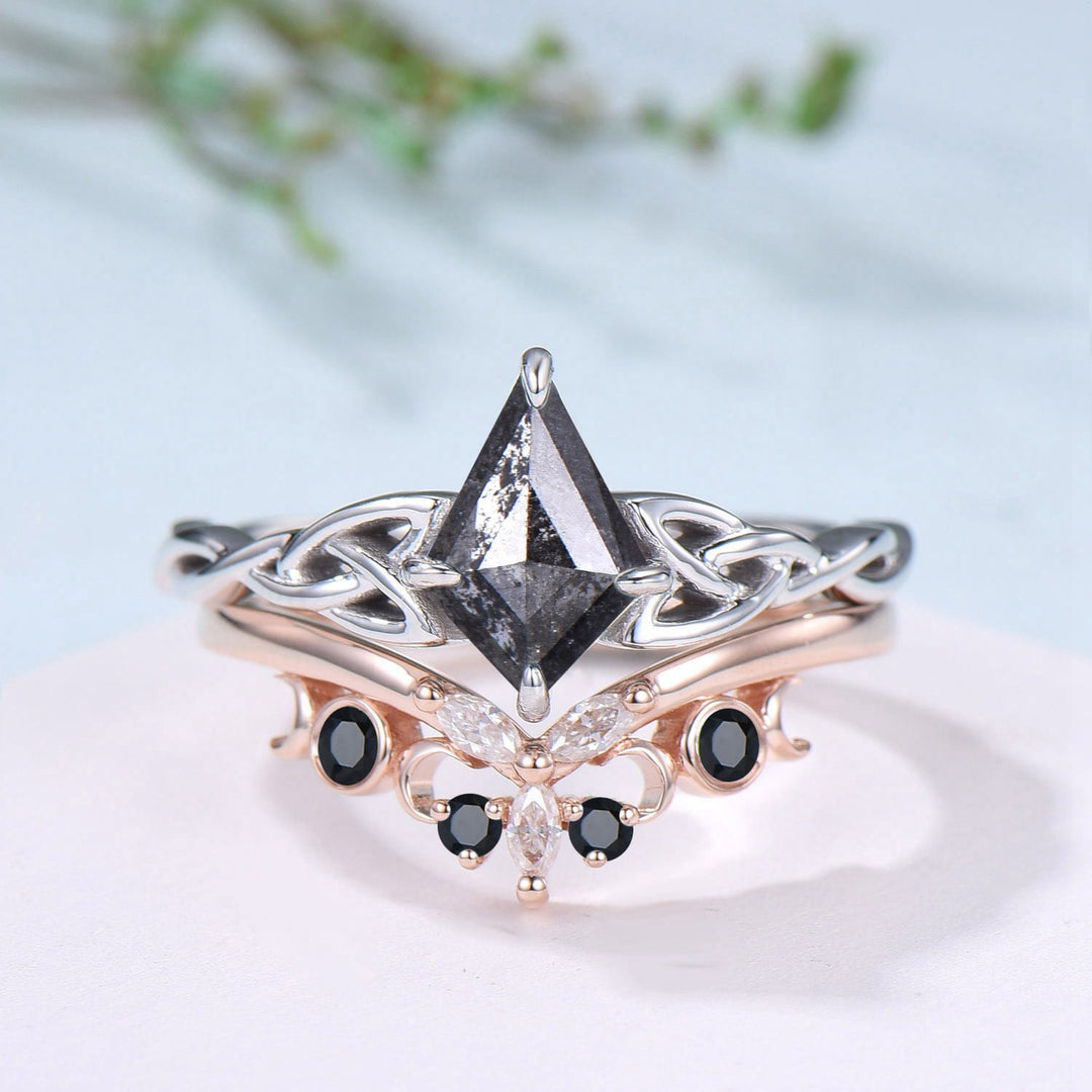 Nature meets elegance in the most enchanting way! This kite-cut moss agate ring set in bold black gold is a true showstopper. With leaf and branch details and vibrant green agate accents, it's the perfect pick for brides who love standing out.