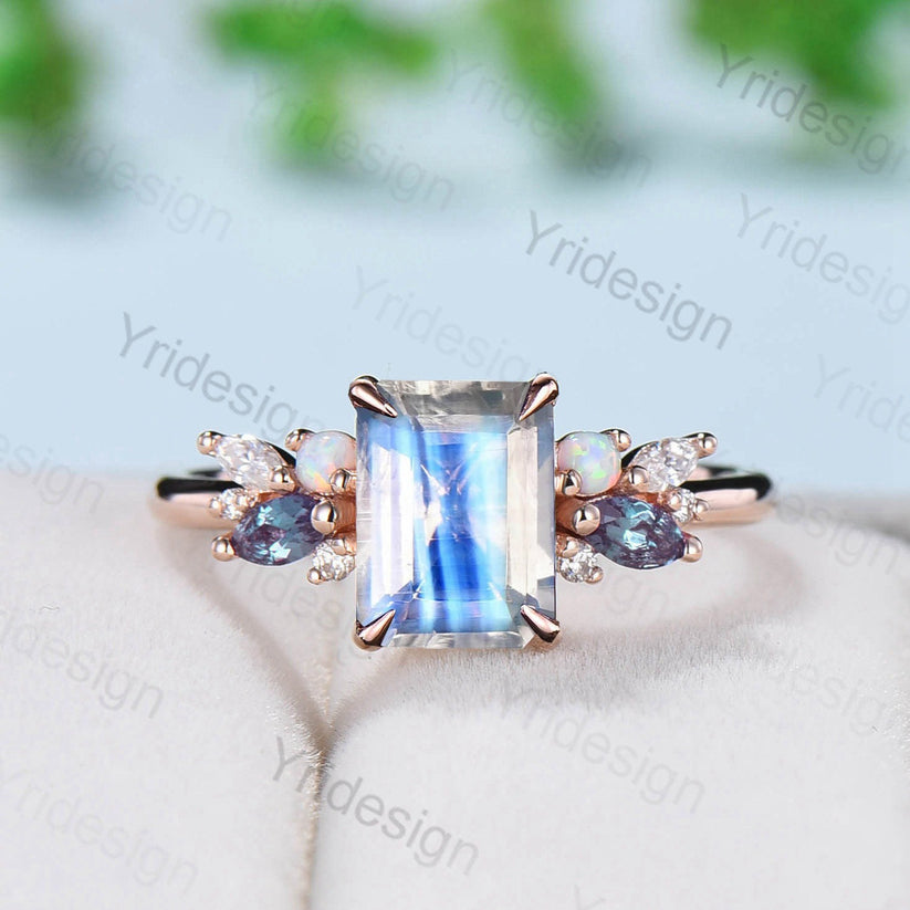 Emerald Cut Moonstone Engagement Ring Alternative Alexandrite Opal