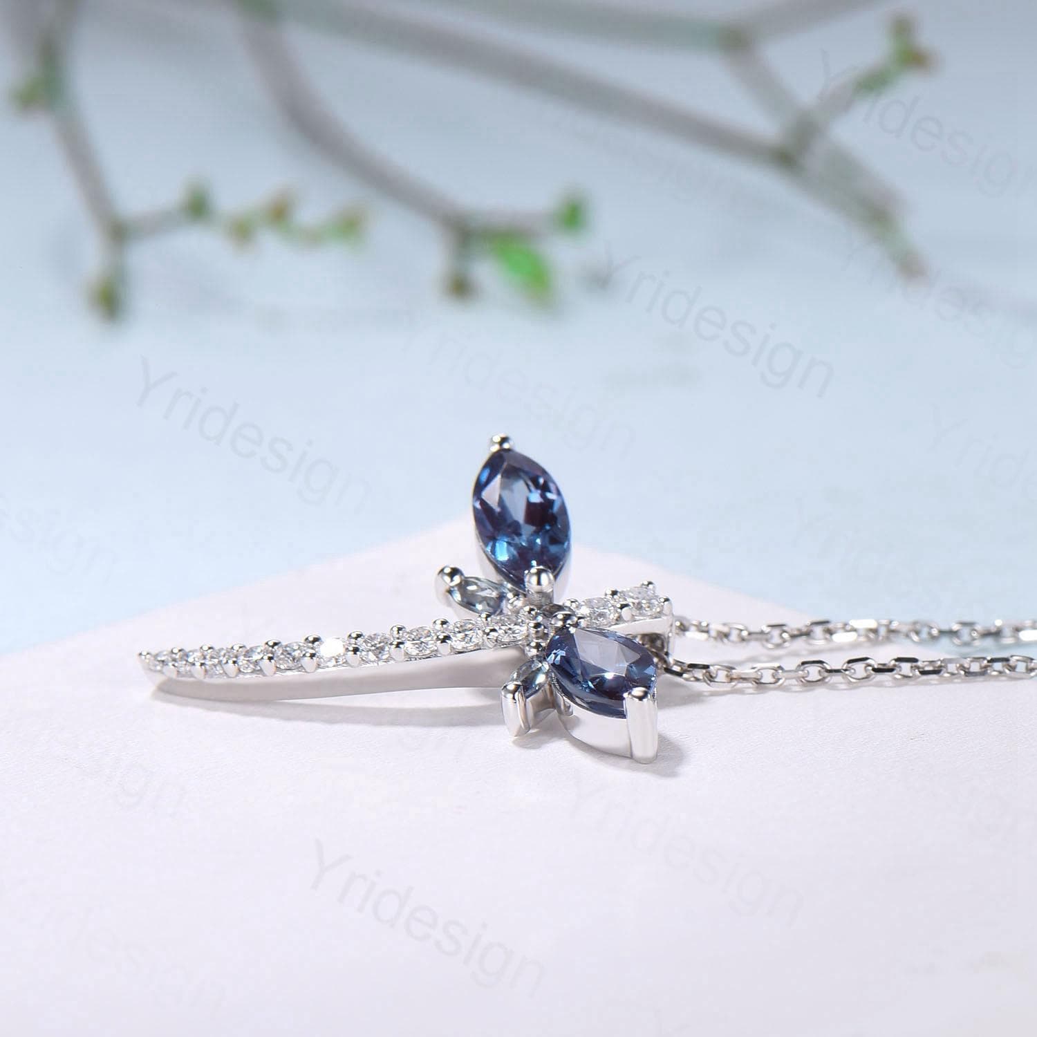 Alexandrite Dragonfly Necklace with Moissanite Diamonds - Dainty Iridescent Insect Jewelry for Women, Delicate Nature-Inspired Pendant Gift