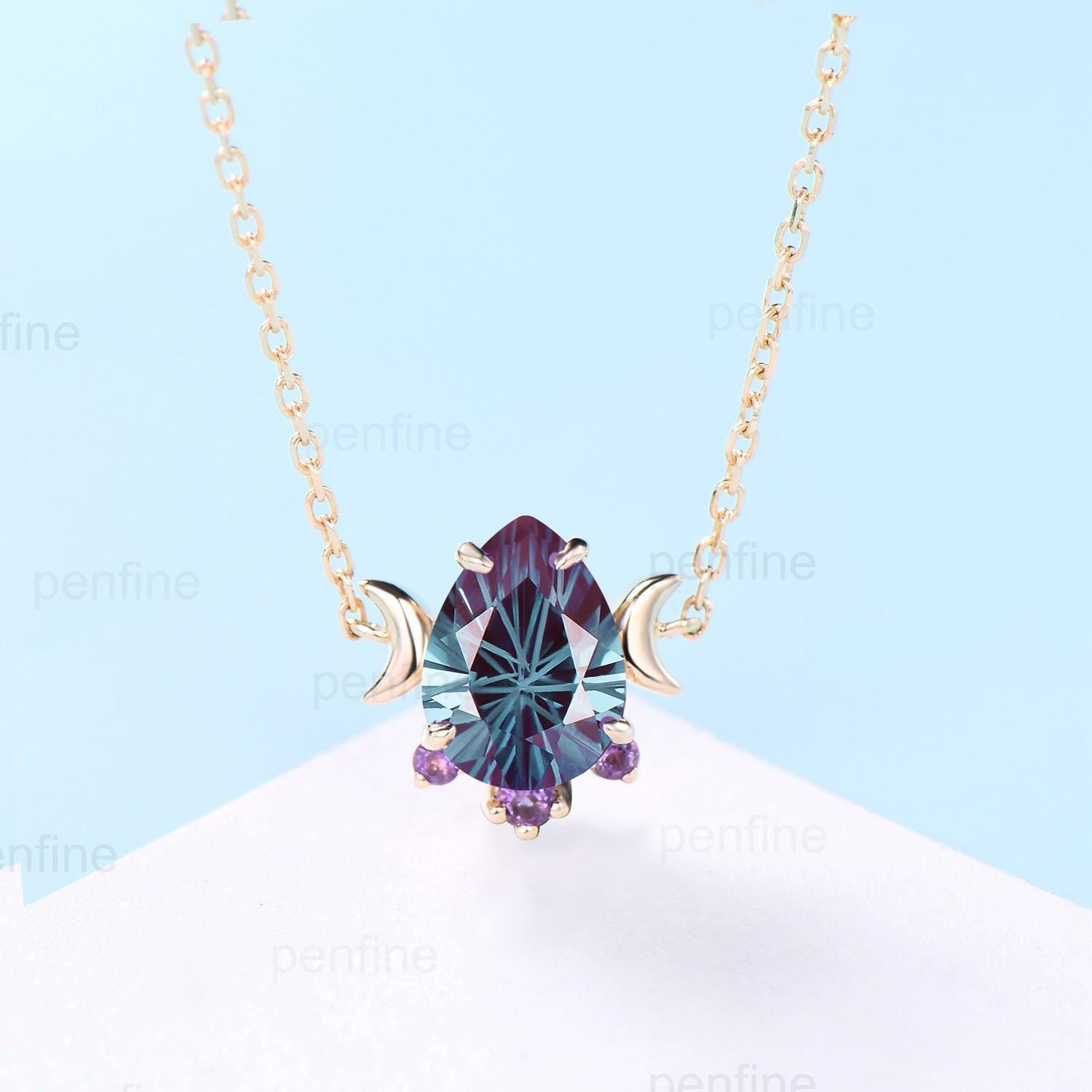 Teardrop Fireworks Cut Alexandrite Pendant Necklace, Cluster Amethyst, Crescent Moon, Sterling Silver