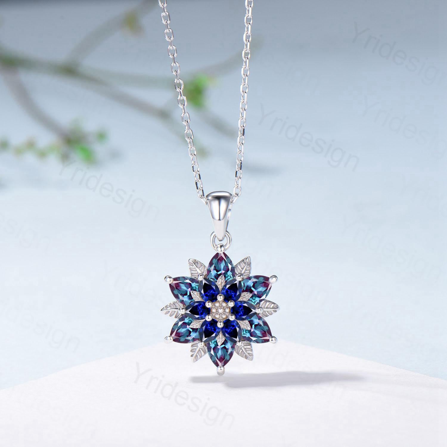 Unique Sunflower Alexandrite Necklace Art Deco Sapphire Pendant Necklace Double Halo Floral Pendant Leaf Vine Anniversary Promise Gift