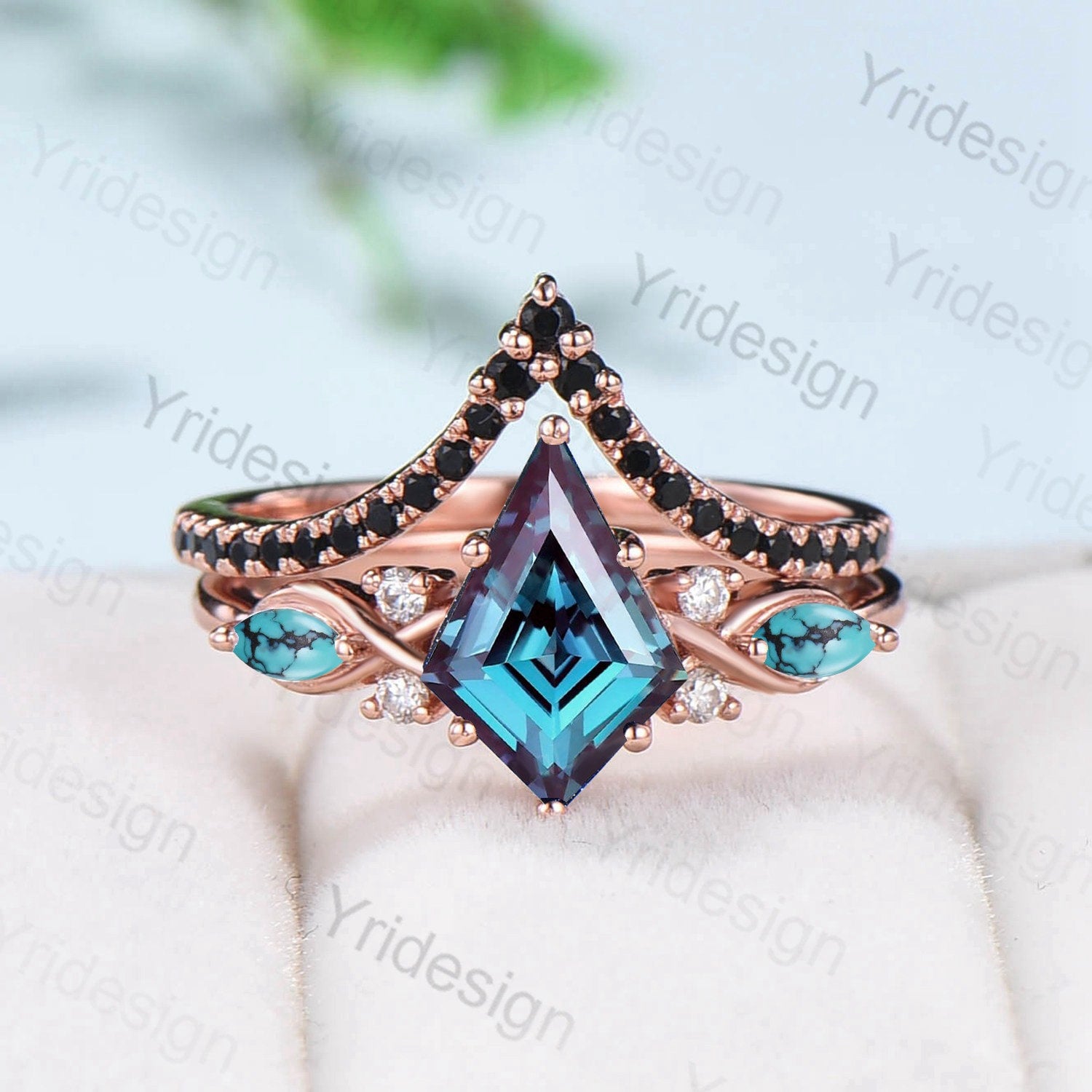 Vintage alexandrite engagement ring set kite cut rose gold twisted unique wedding ring set marquise turquoise black diamond promise ring