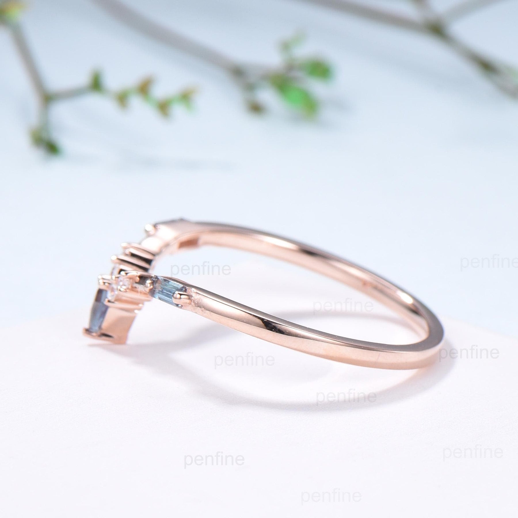 Curved Kite and Baguette Cut Alexandrite Wedding Band, Rose Gold Cluster Moissanite Ring