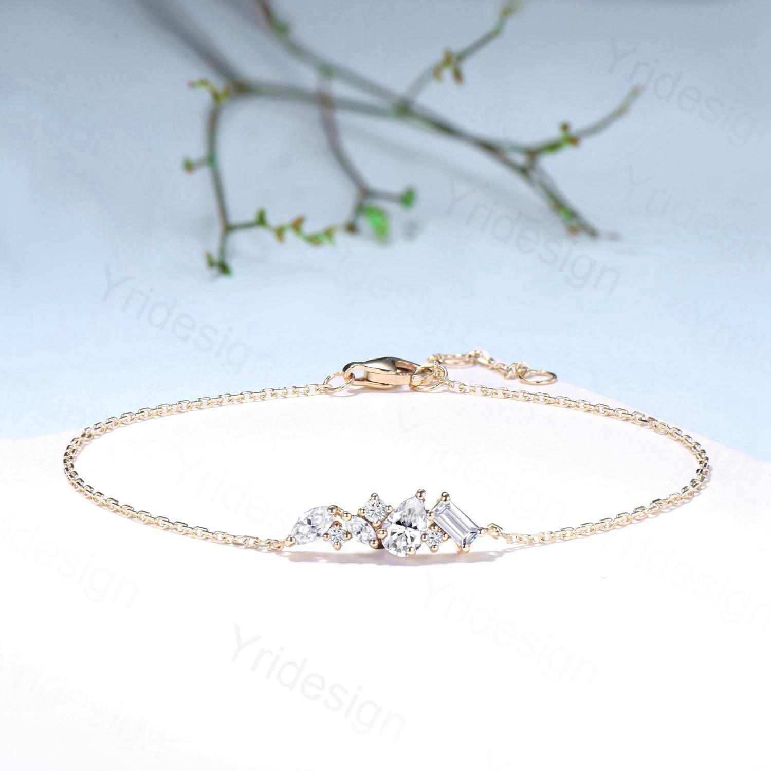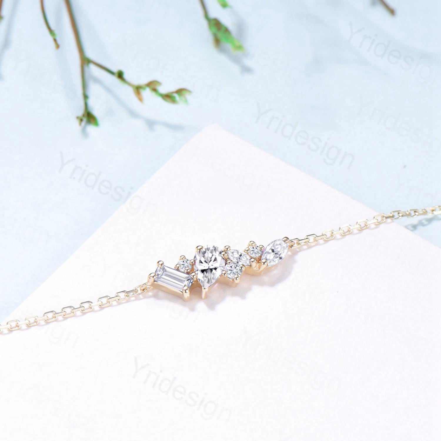 Dainty Pear Shaped Moissanite Bracelet Multi-Stone Baguette Lab Grown Diamond Lobster Claw Bracelet Silver Gold Art Deco Anniversary Gift