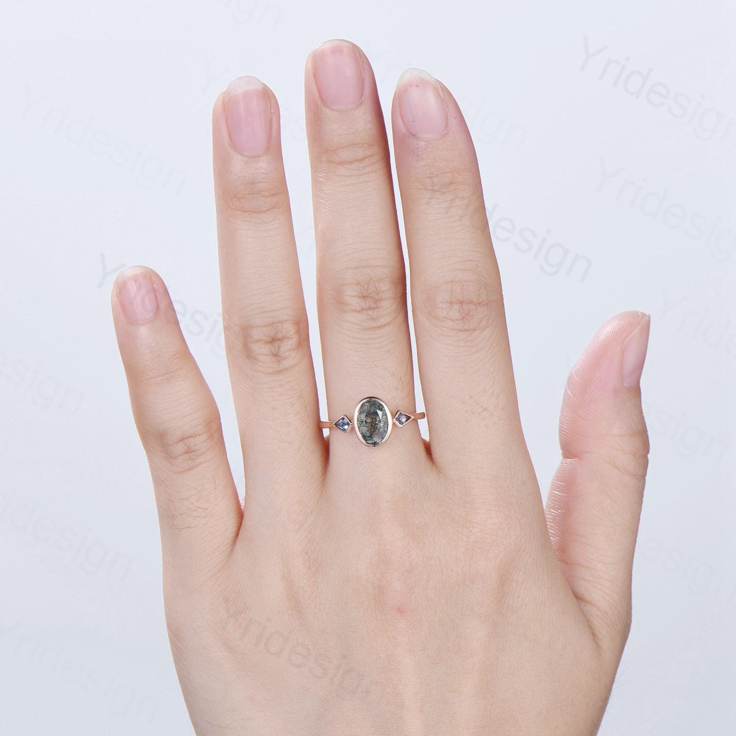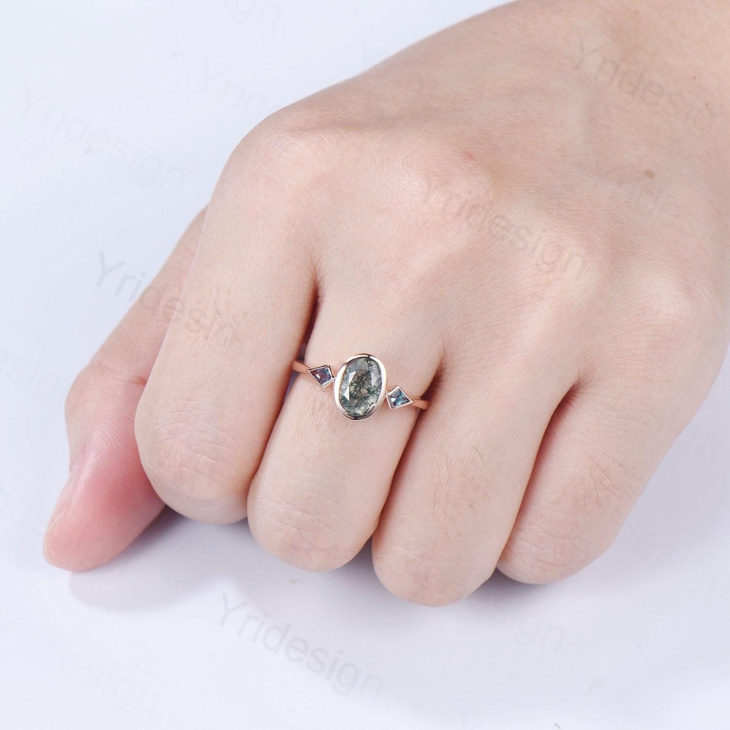 Oval Moss Agate Engagement Ring, Kite Alexandrite Accent, Bezel Set