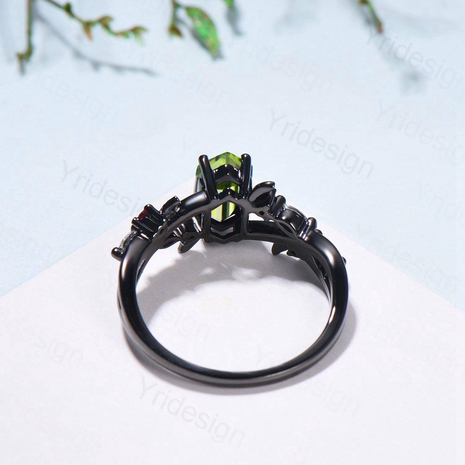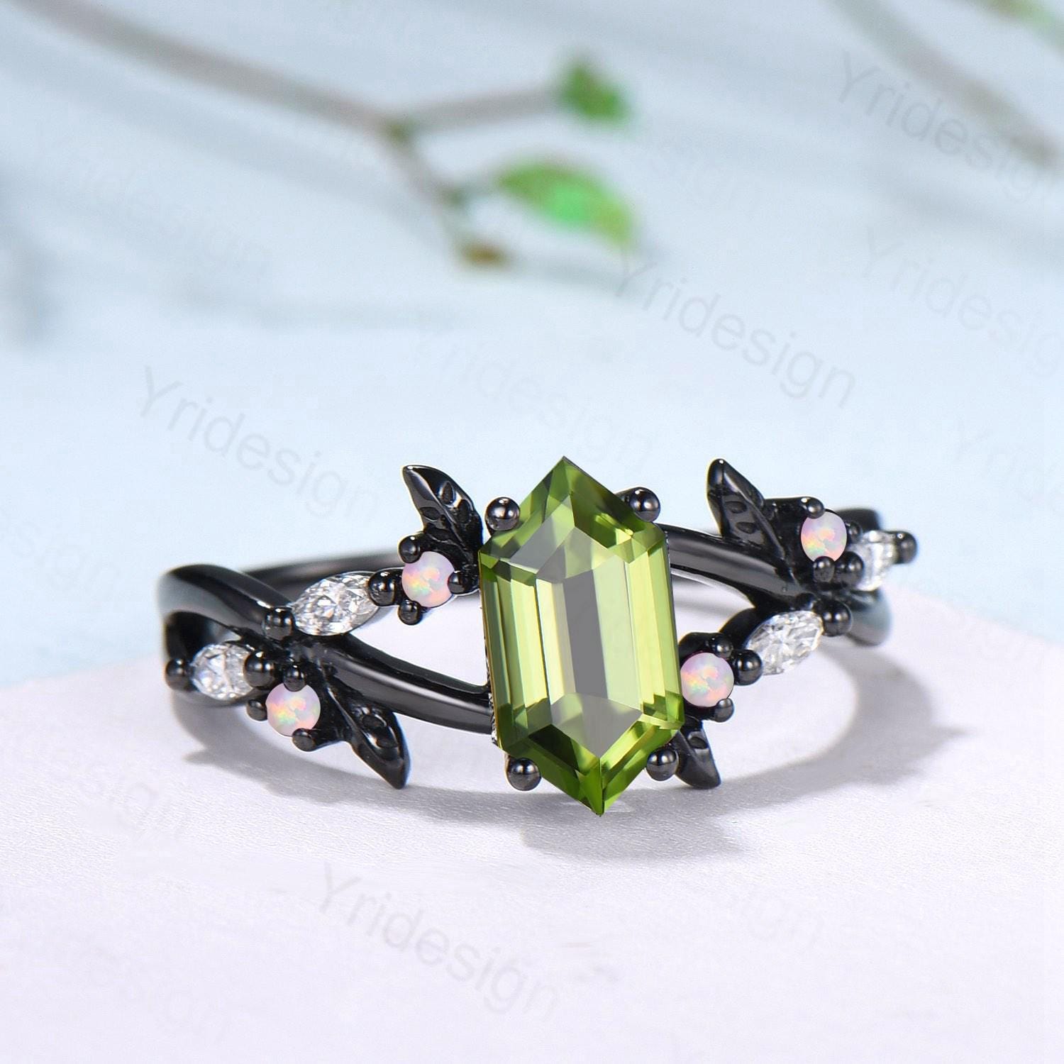 Unique Black Gold Natural Peridot Engagement Ring, Gothic Opal Moissanite Leaf Vine Wedding Ring Long Hexagon Cut August Birthstone Jewelry