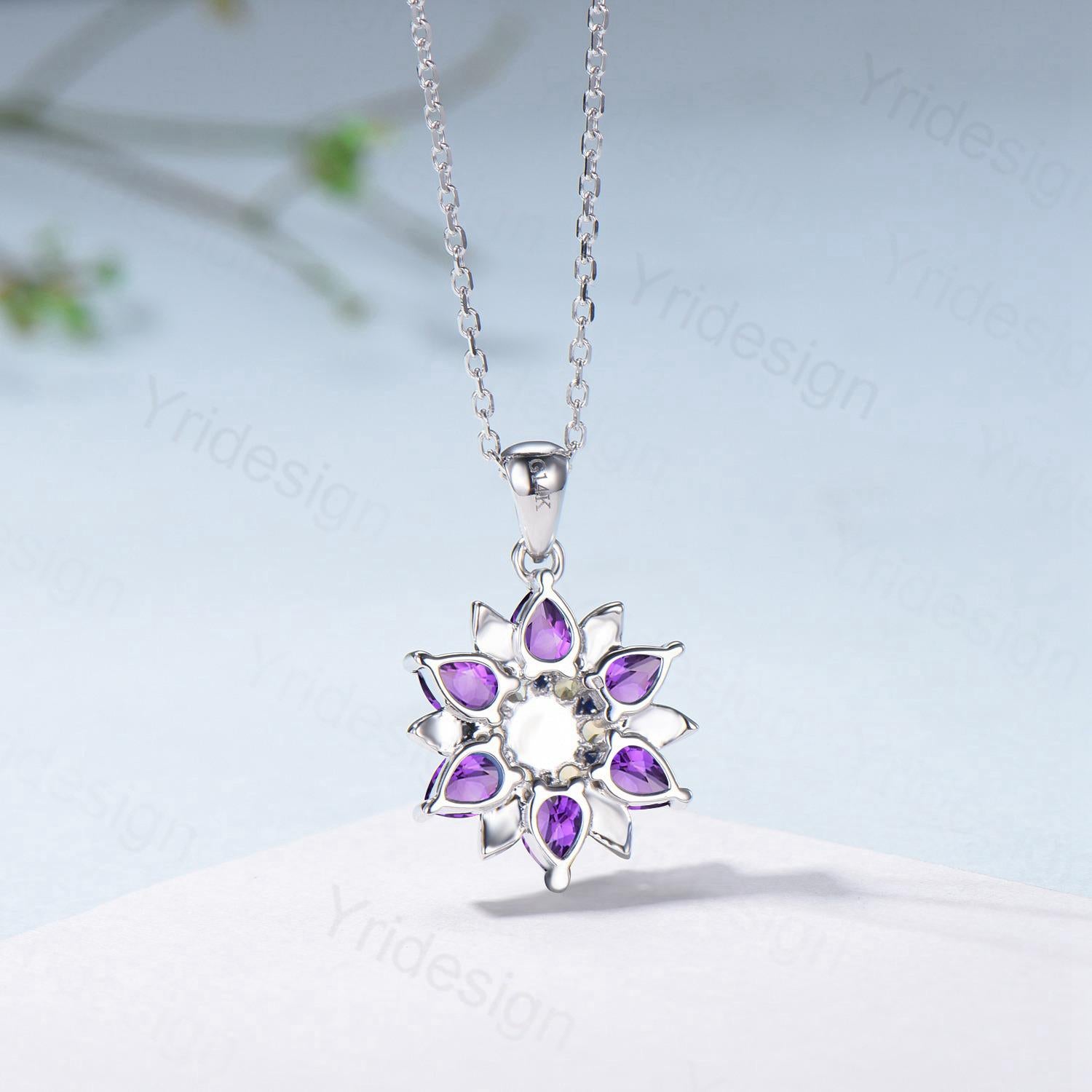 Unique Sunflower White Opal Amethyst Necklace Elegant Natural Inspired Double Halo Floral Pendant Leaf Vine Anniversary Promise Gift