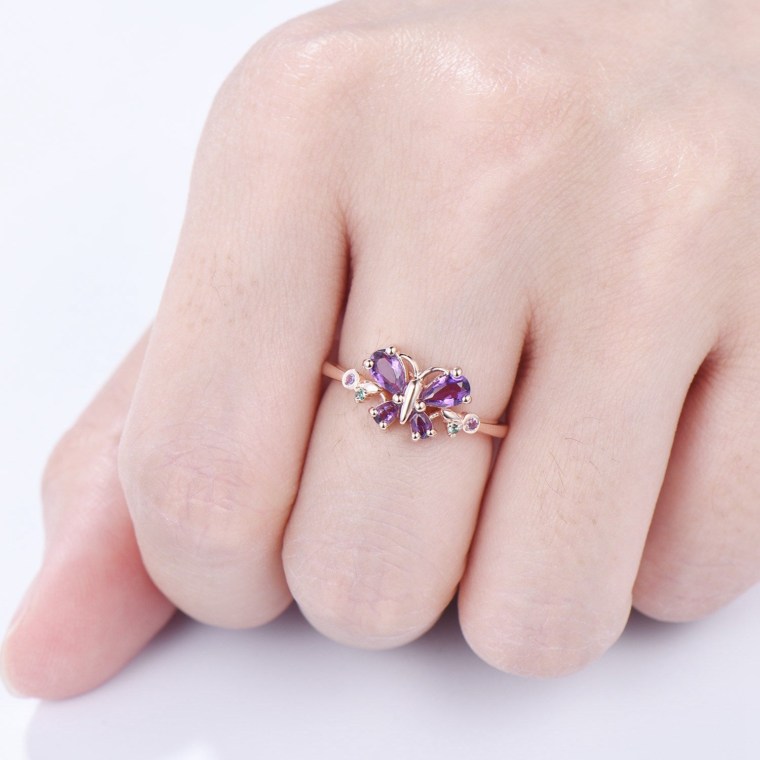 Unique Butterfly Ring Amethyst Engagement Ring teardrop amethyst silver rose gold flower promise ring emerald anniversary gift women