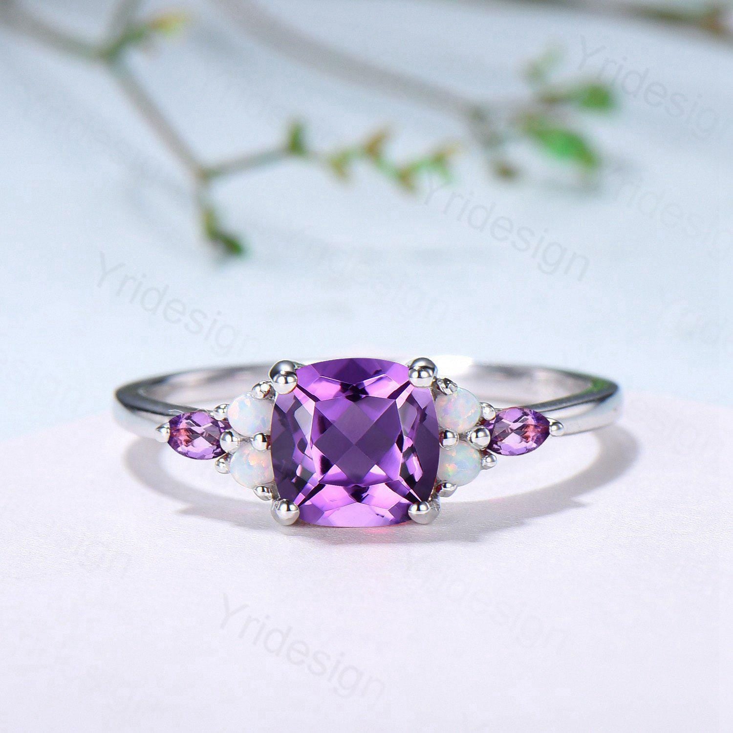 Vintage Cushion Amethyst Engagement Ring Set, Opal Leaf Vine Band