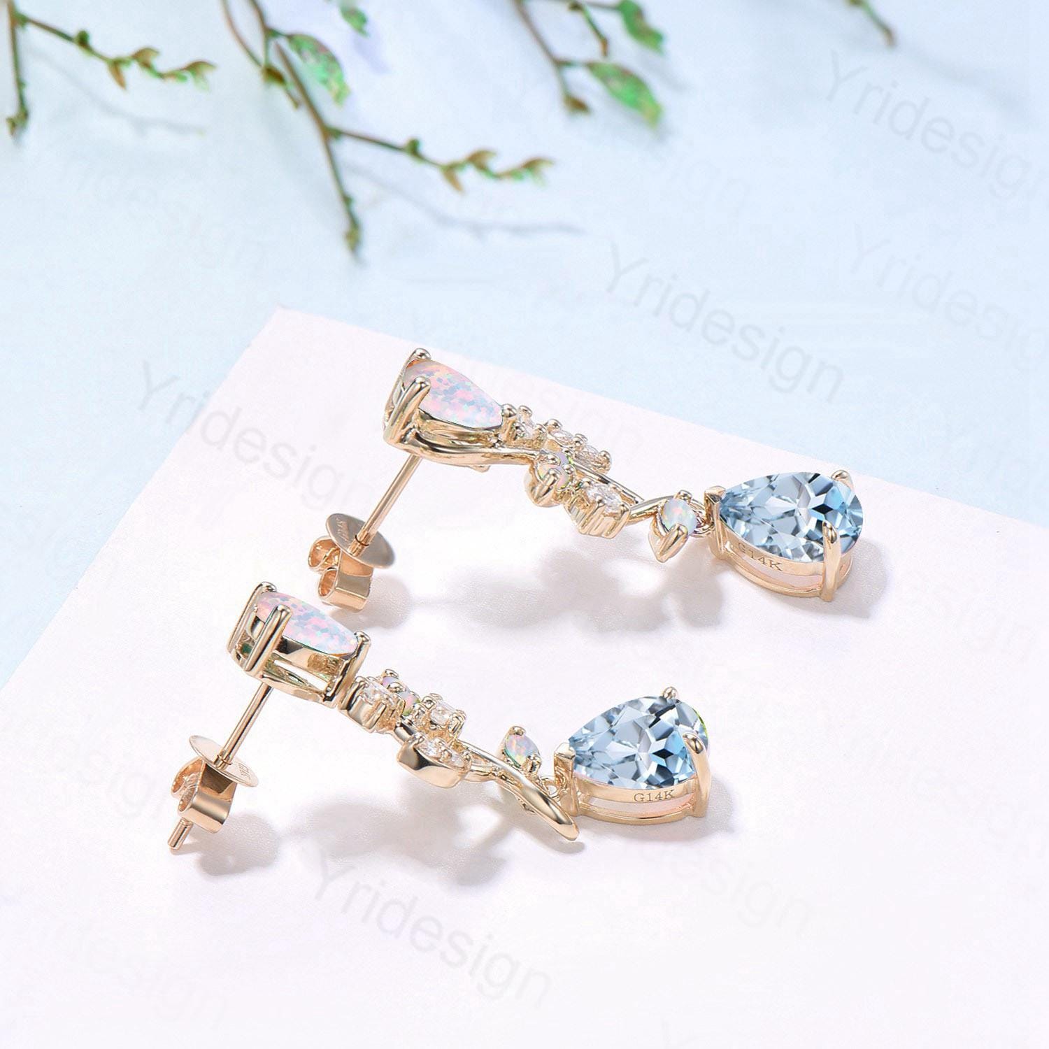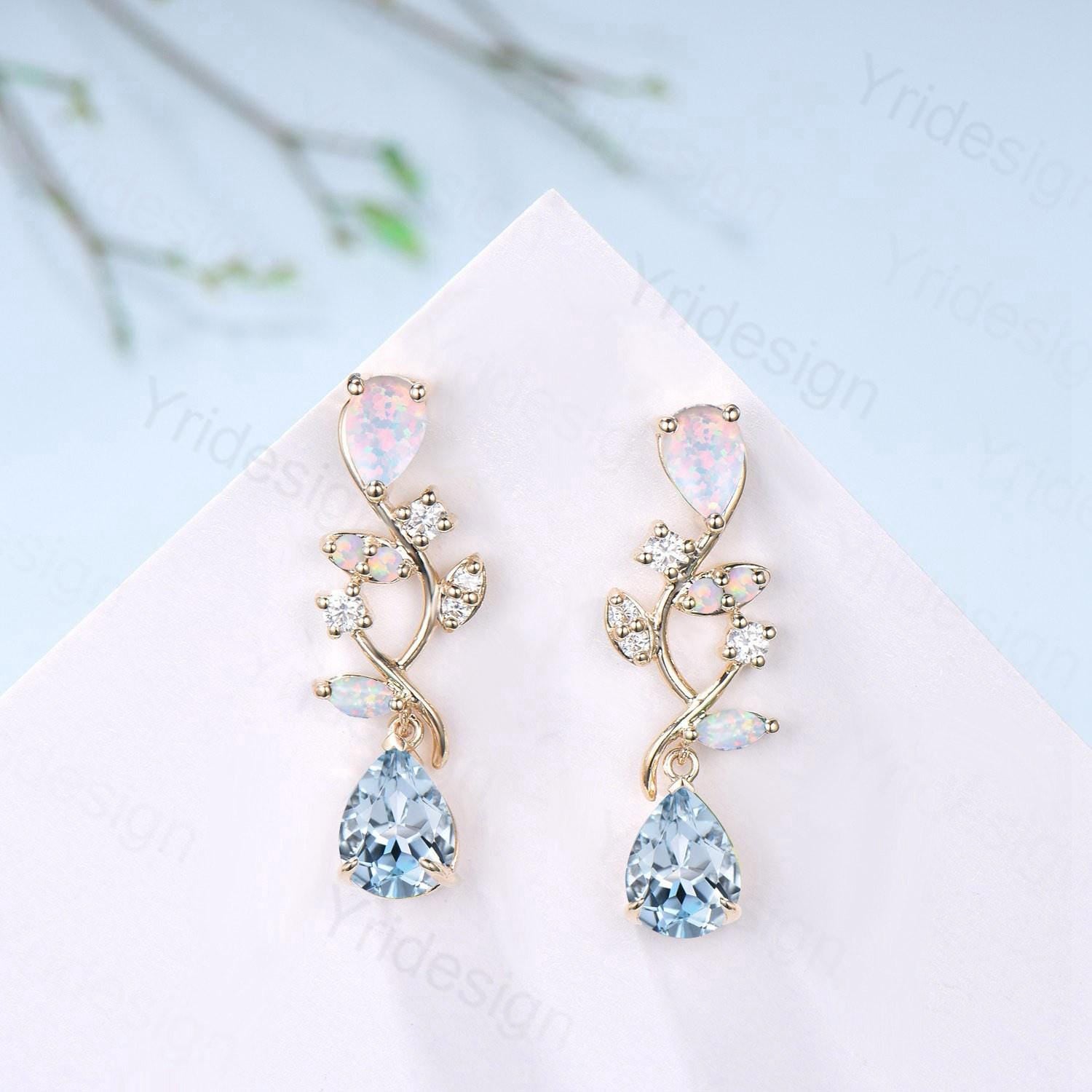 Nature Inspired Pear Shaped Aquamarine Earrings Elegant Opal Leaf Vine Earrings Silver Earrings Handmade March Birthstone Anniversary Gift