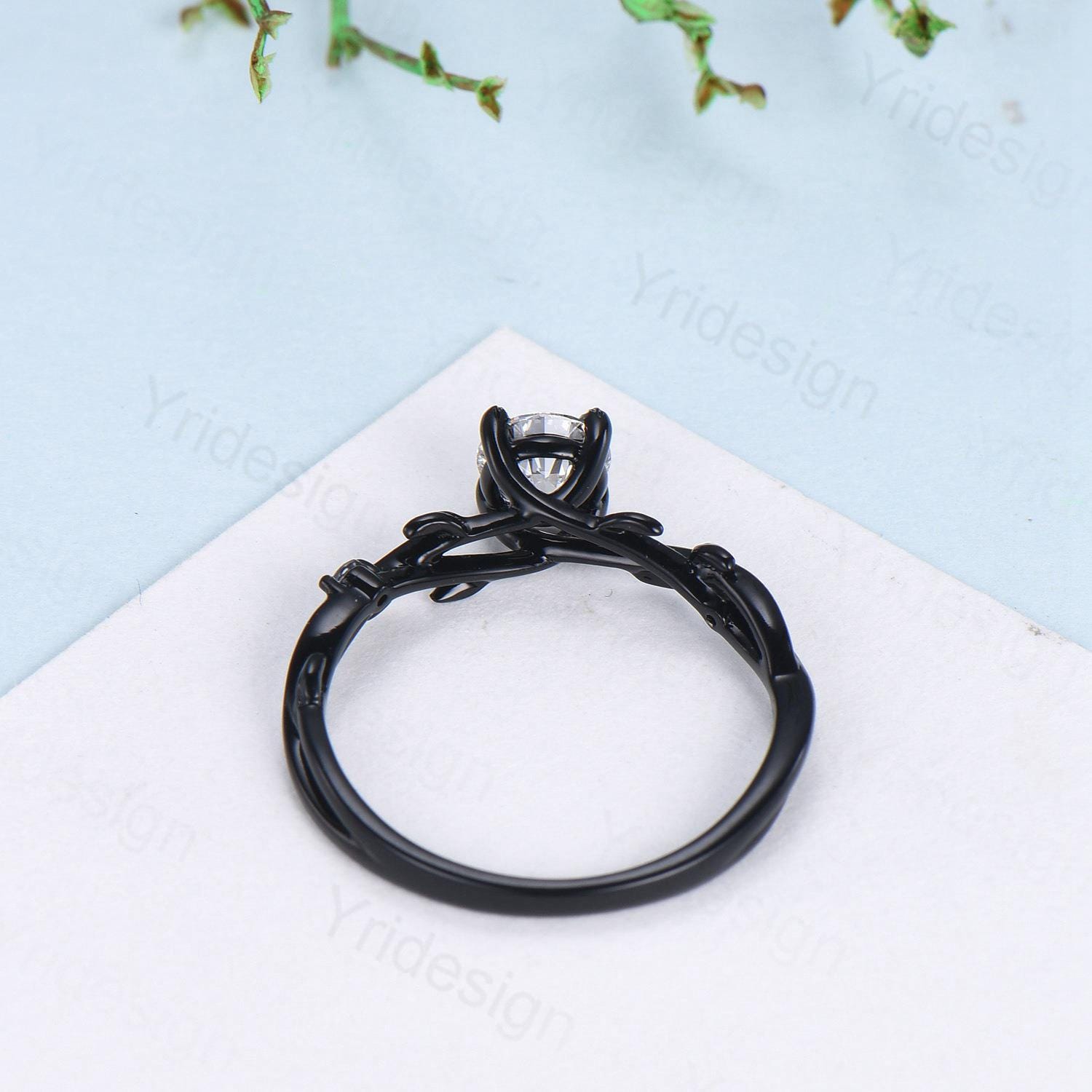 Leaf Moissanite Engagement Ring, Black Gold Moonstone Accent, Nature Inspired