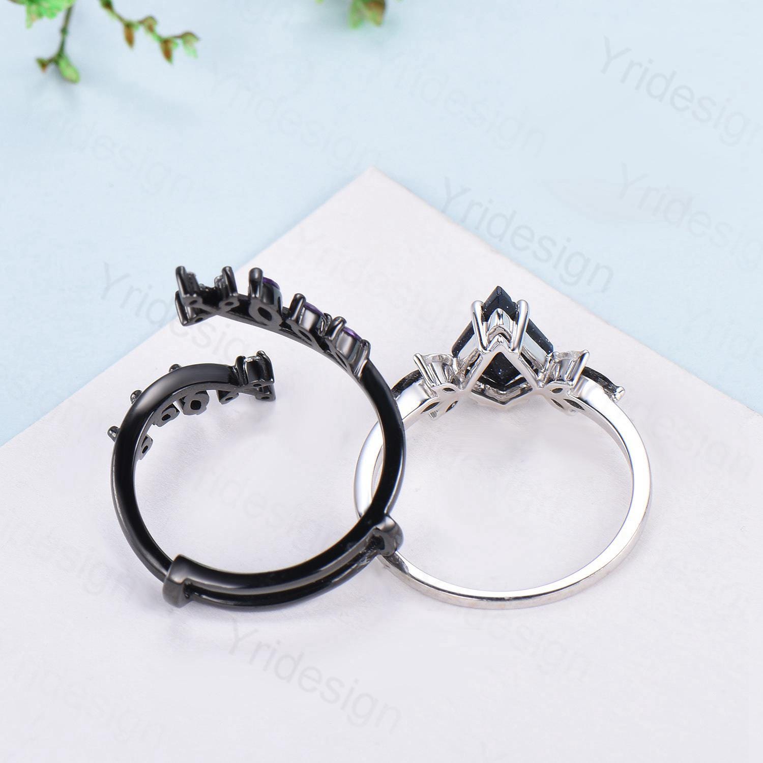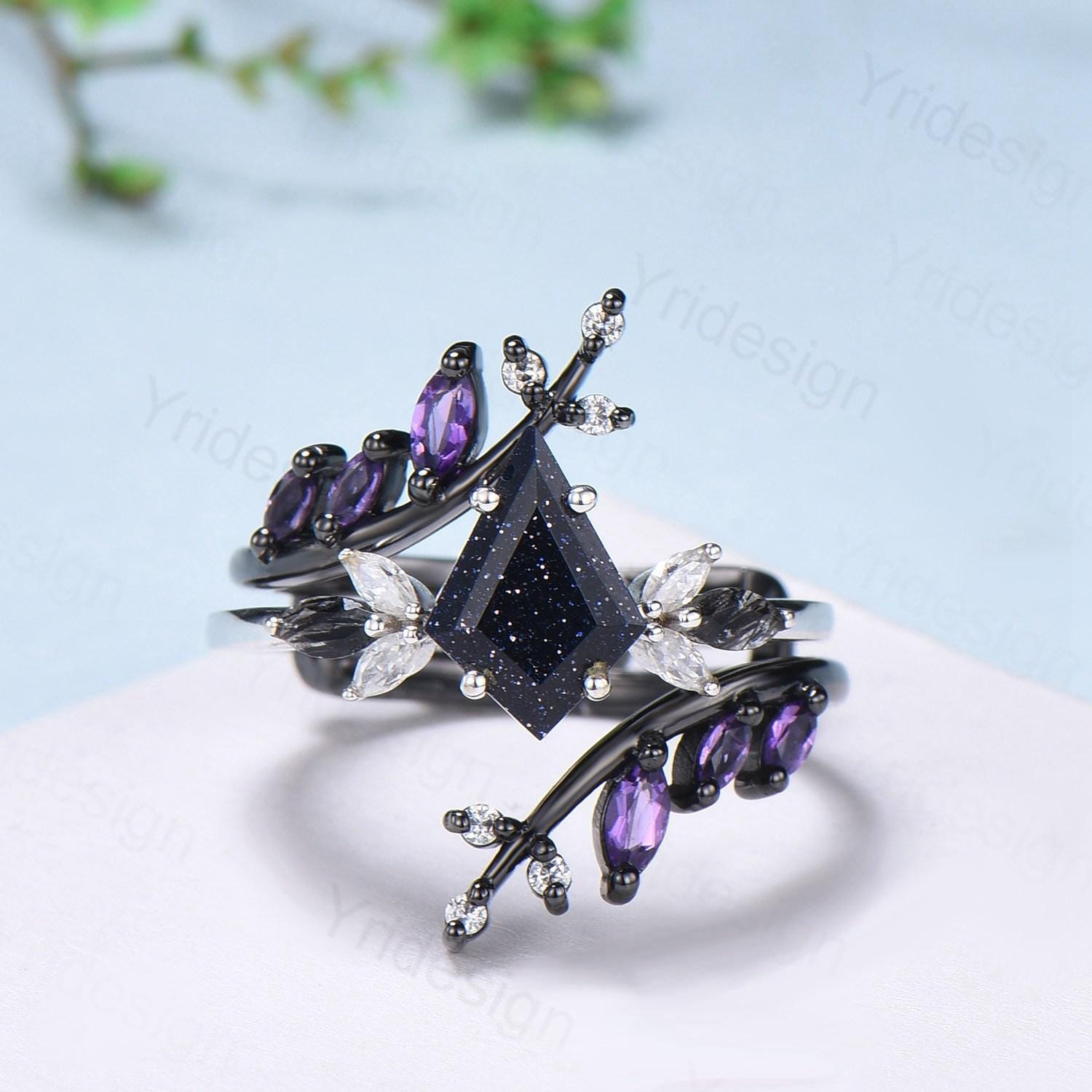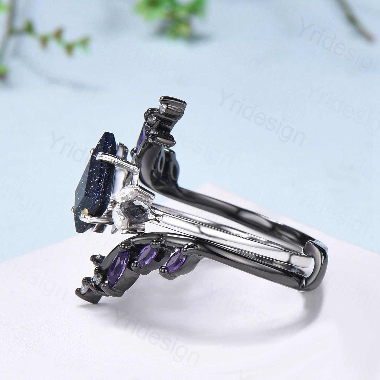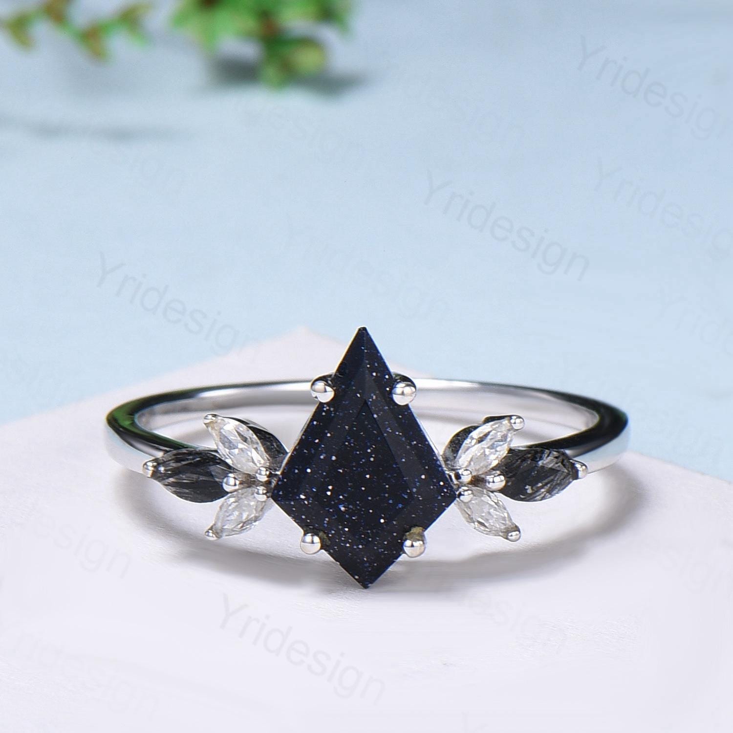 Kite Blue Sandstone Ring Set, Marquise Rutilated Quartz, Art Deco Bridal Ring