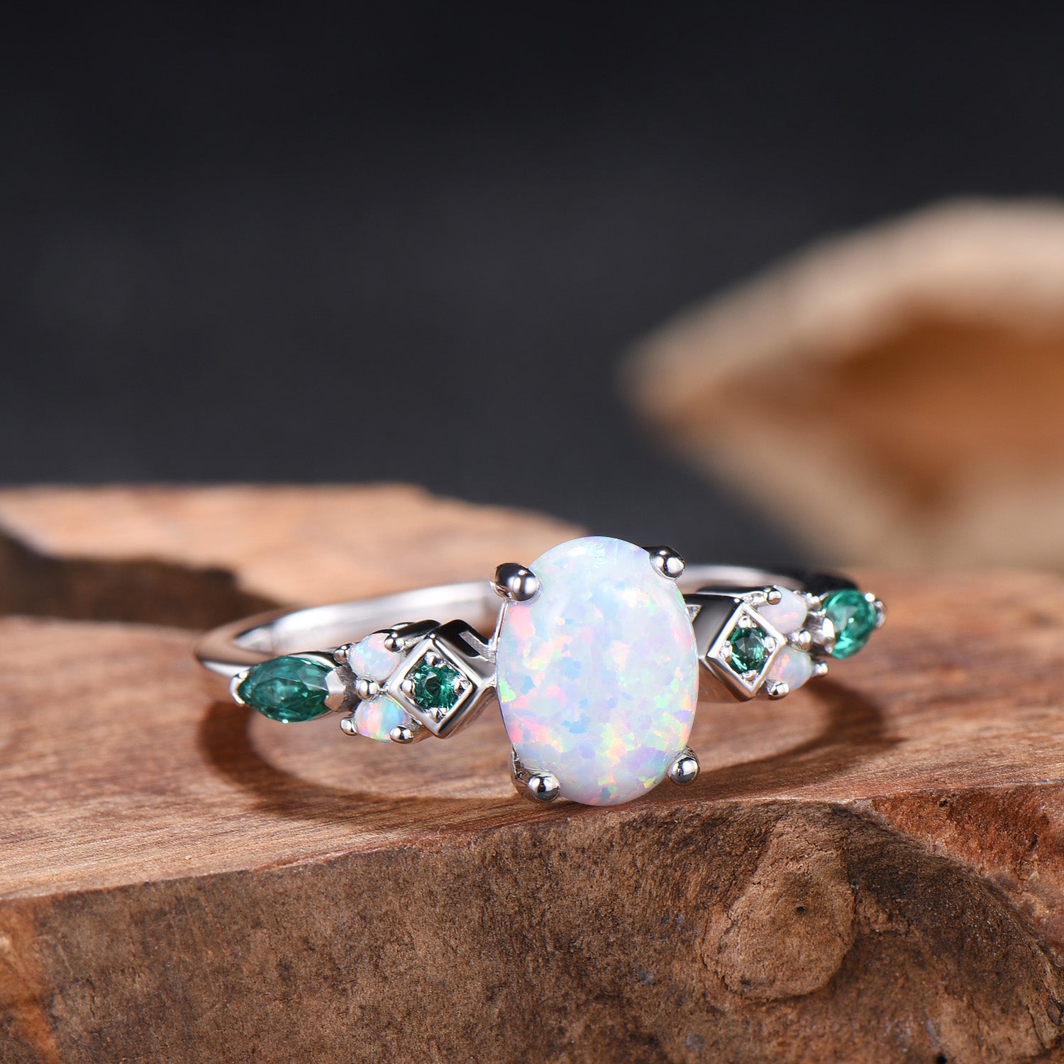 Vintage White Opal Engagement Ring Cluster Emerald Fire Opal Wedding Ring October Birthstone Bridal Ring Rose Gold Anniversary Ring Women