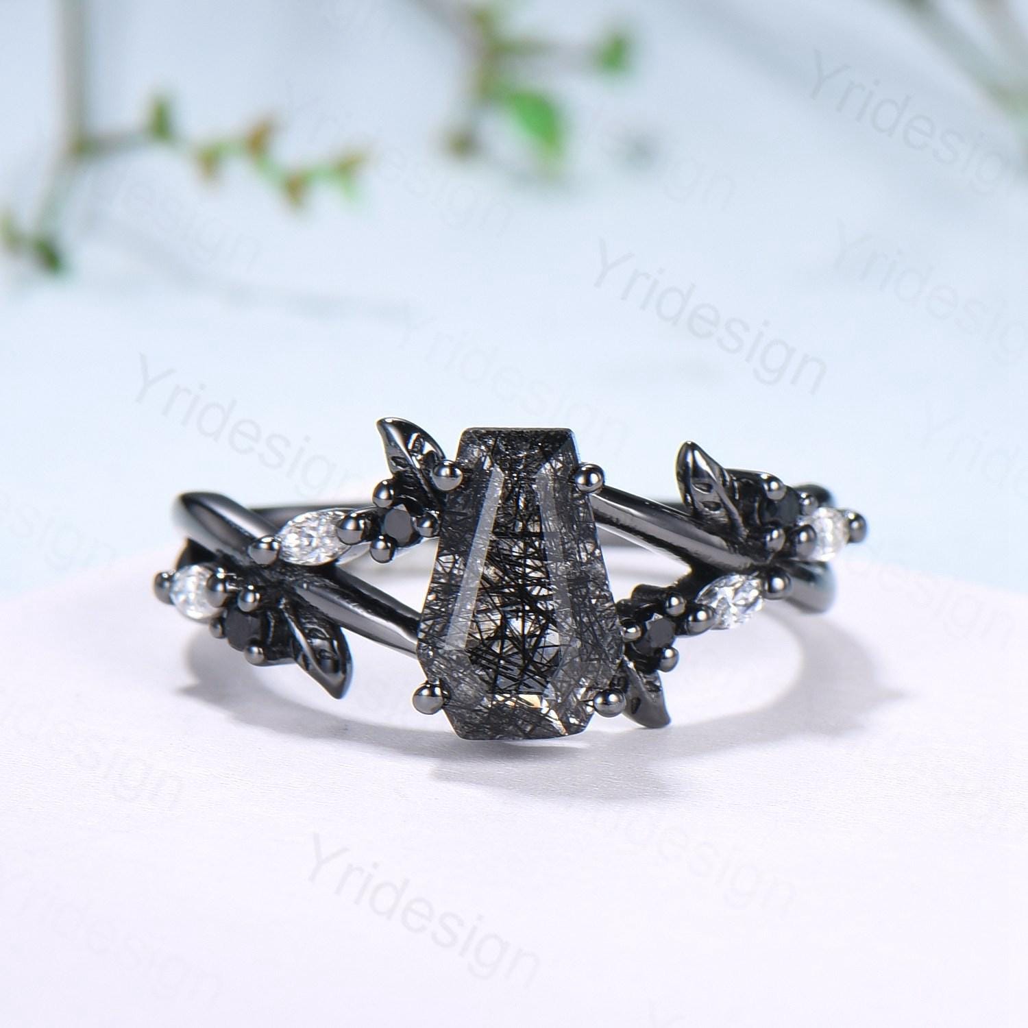 Gothic coffin cut black rutilated quartz engagement ring set black gold cluster engagement ring leaf vine nature inspired agate wedding set