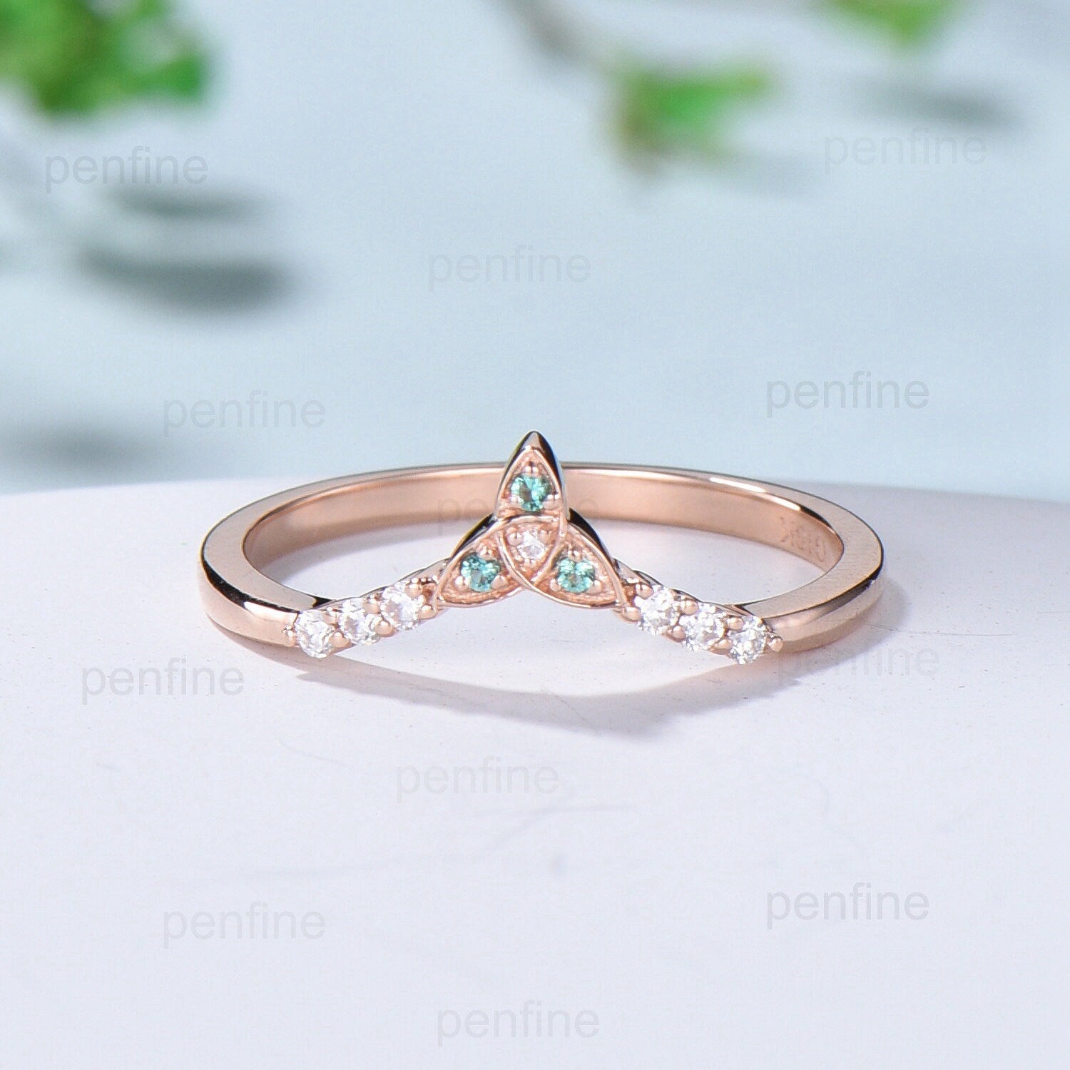 Emerald Moissanite Rose Gold Wedding Band, Vintage Stacking Ring - PENFINE