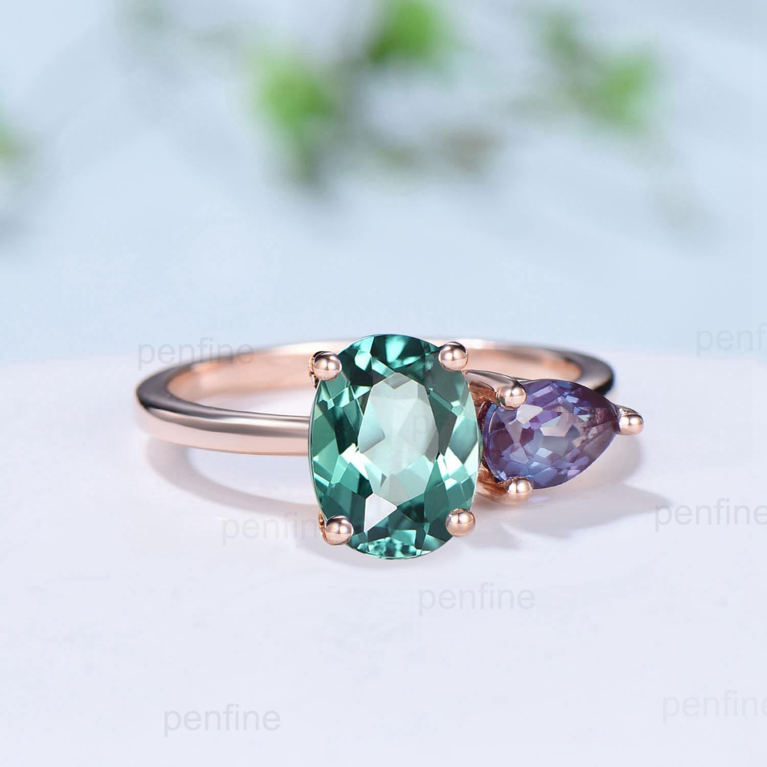 Minimalist Two stone oval green sapphire and pear shaped alexandrite engagement ring rose gold simple wedding ring anniversary bridal gifts