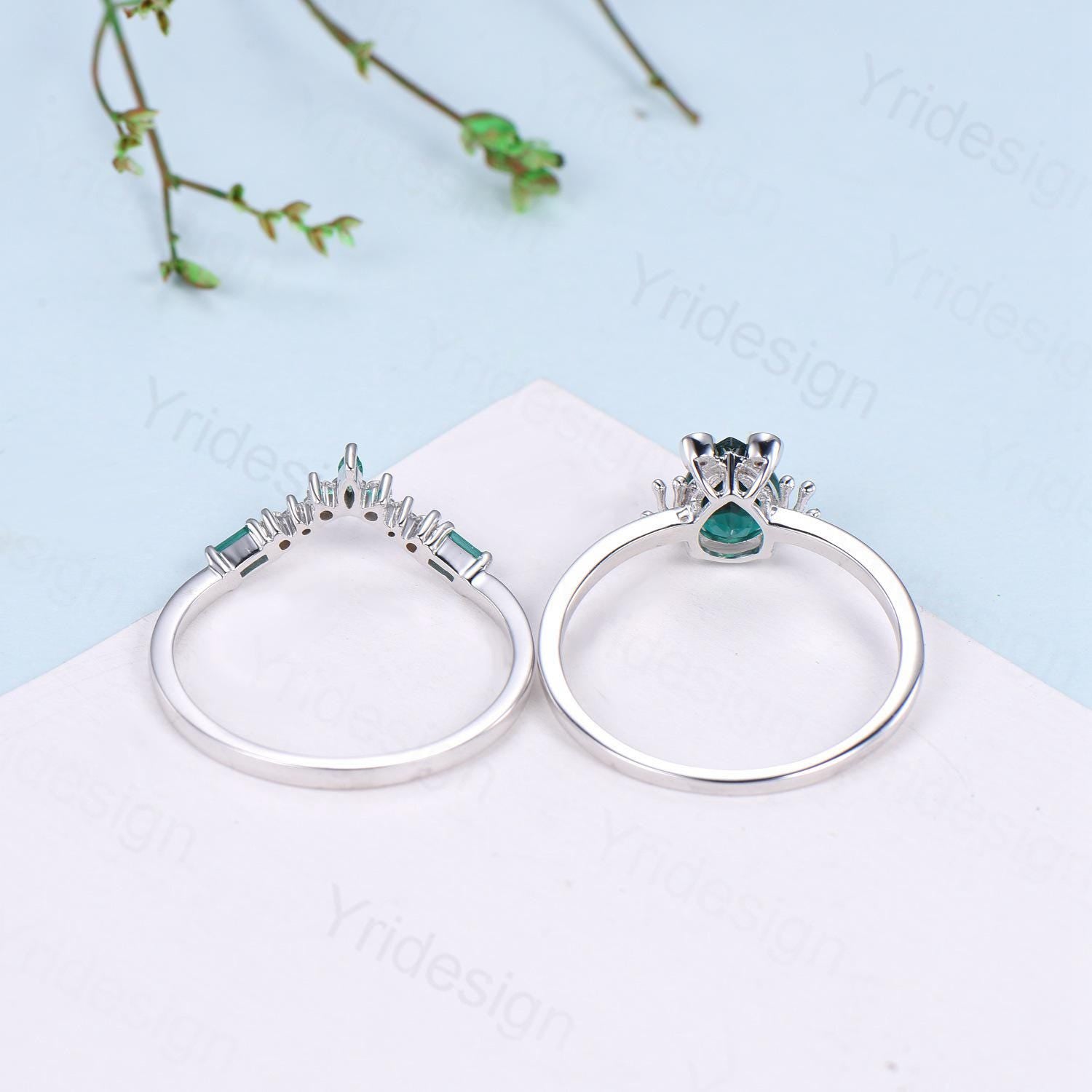 Unique emerald engagement ring set, Frog animal inspired May birthstone wedding set, women pear shaped bridal set anniversary gift for girl