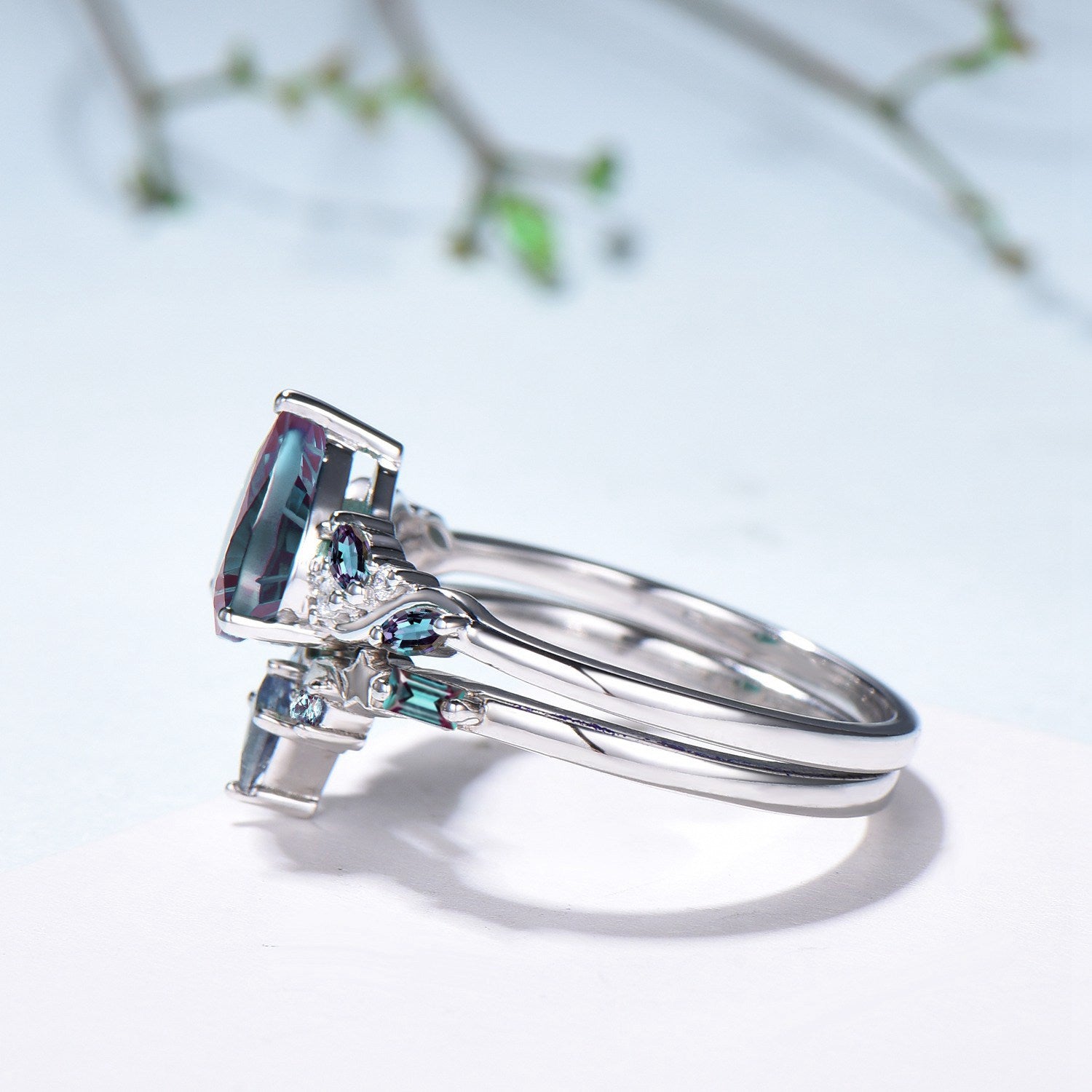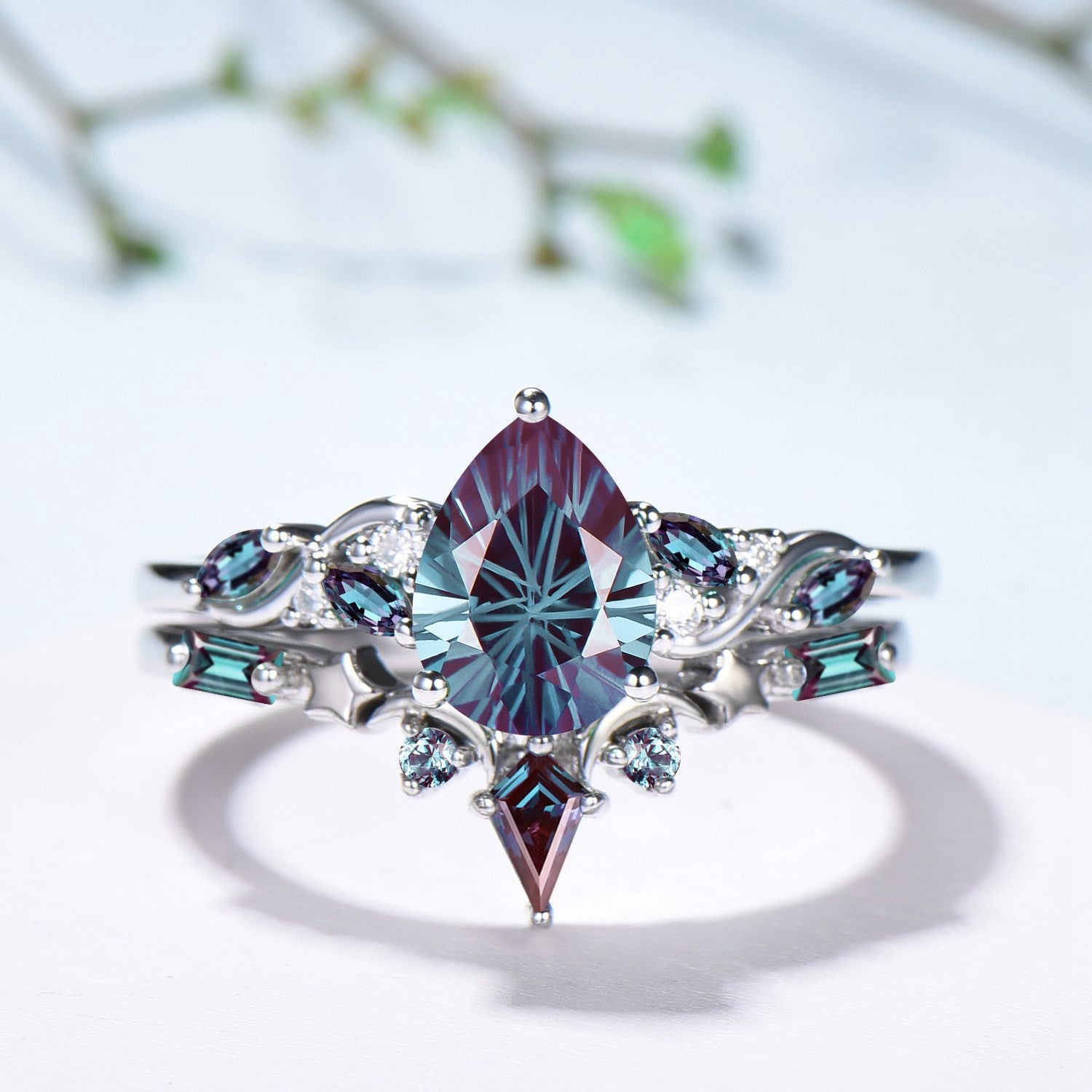 Nebula Teardrop Fireworks Cut Alexandrite Crown Engagement Ring Set: Moon Star Stacking Band