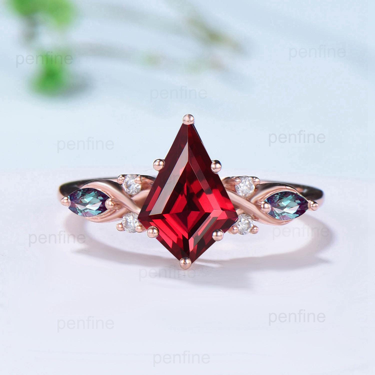 1.5CT Kite Cut Ruby Ring Set/Ruby Engagement Ring Set Women/Marquise Alexandrite Wedding Set/ Opal Leaf Stacking Band/ July Birthstone Ring