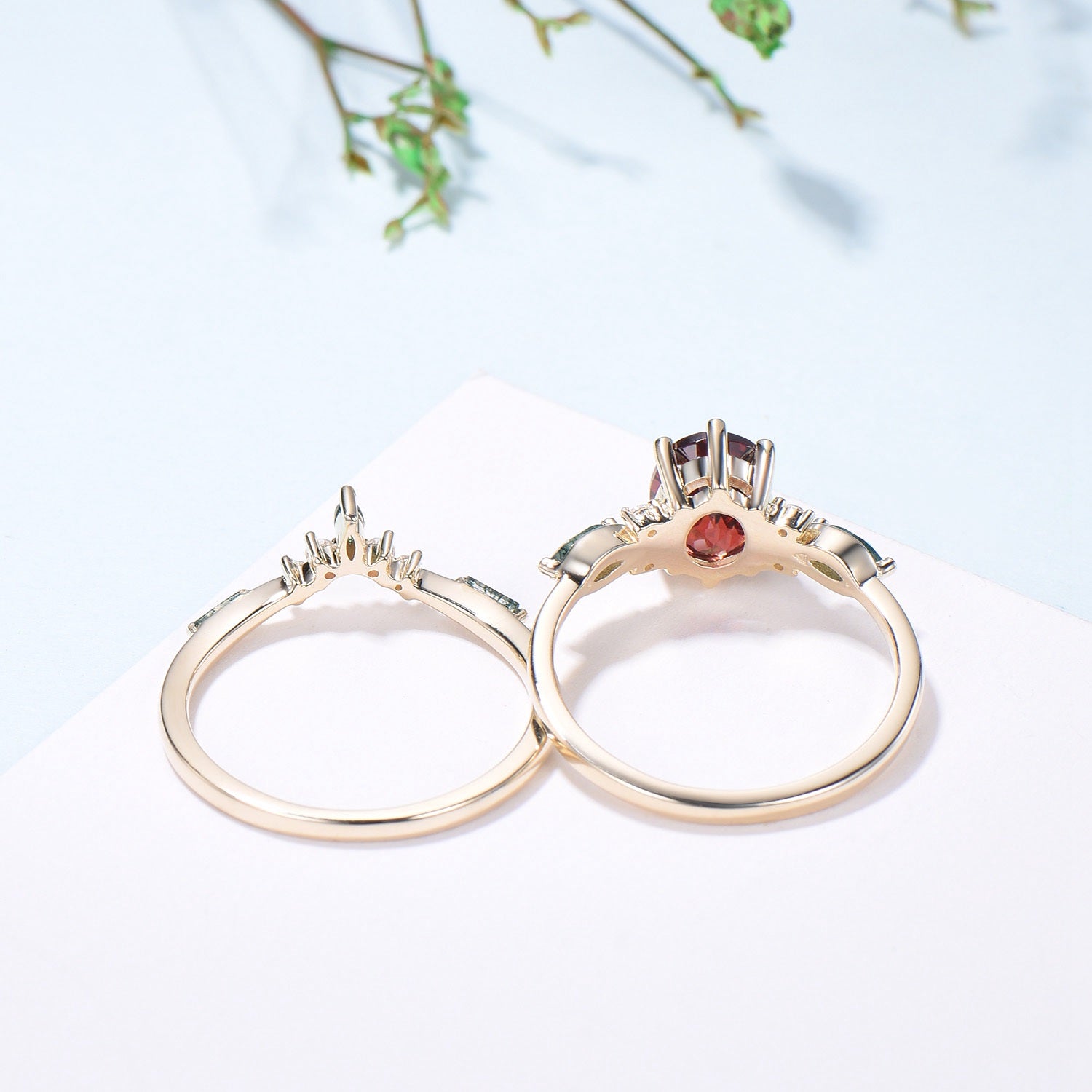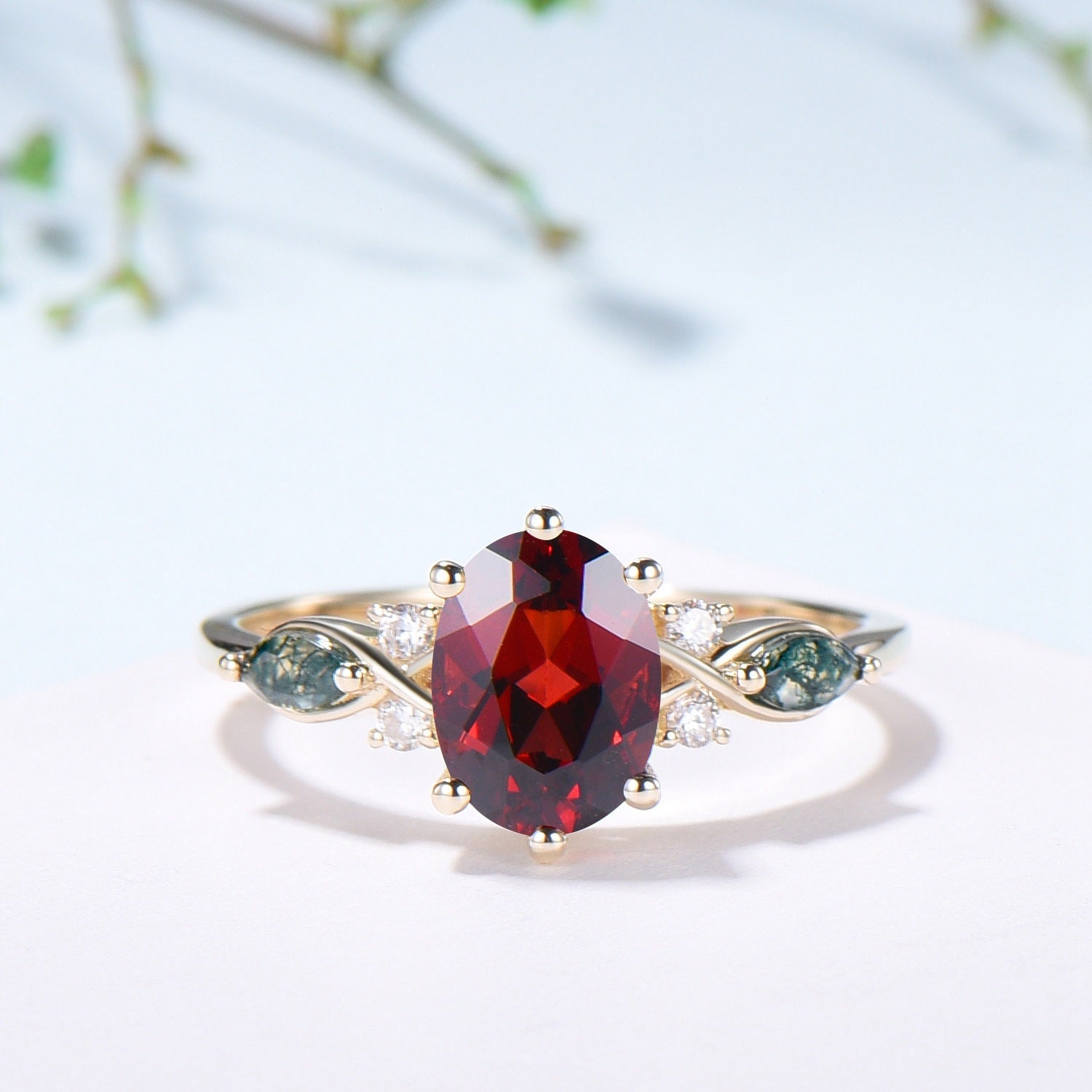 Vintage Oval Garnet Engagement Ring Set, Accent Marquise Moss Agate Yellow Gold Bridal Ring