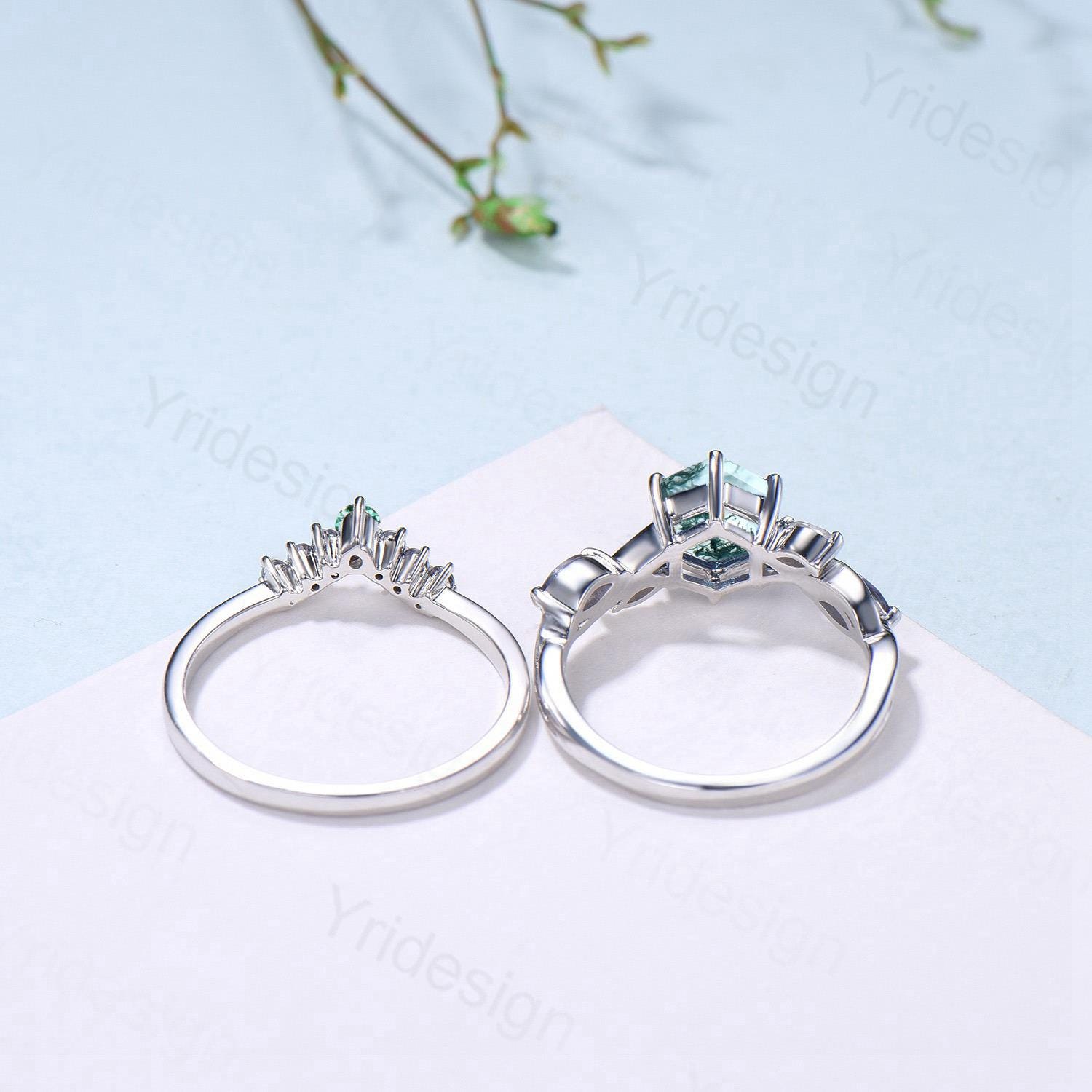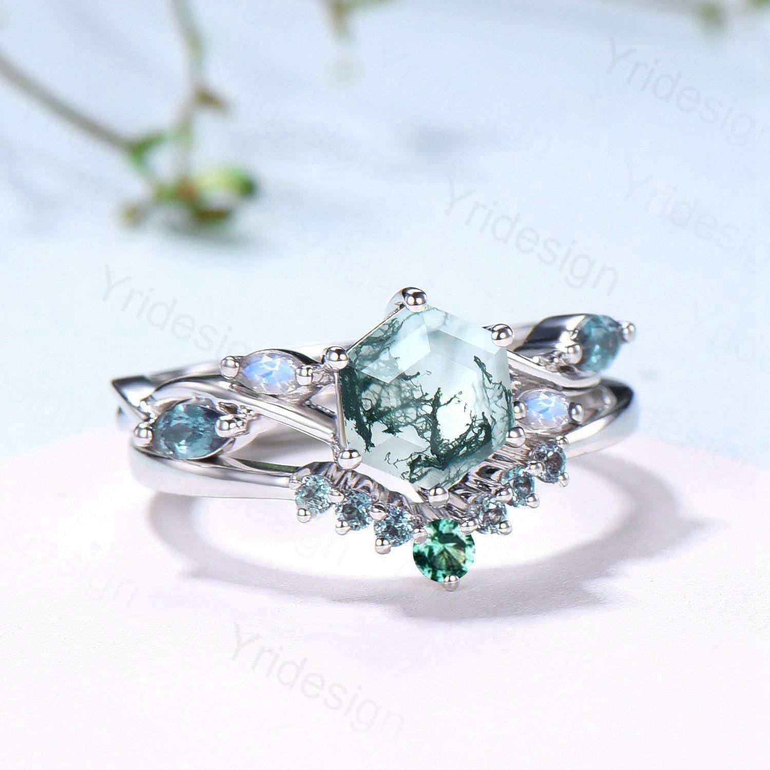 Hexagon Moss Agate Engagement Ring Set, Alexandrite, Moonstone, Emerald Band