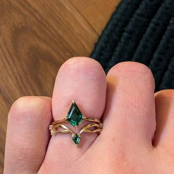 Dainty Emerald Engagement Ring Set Kite Cut Solitaire Minimalist Wedding Set Rose Gold Art Deco May birthstone Bridal Set Anniversary Gift