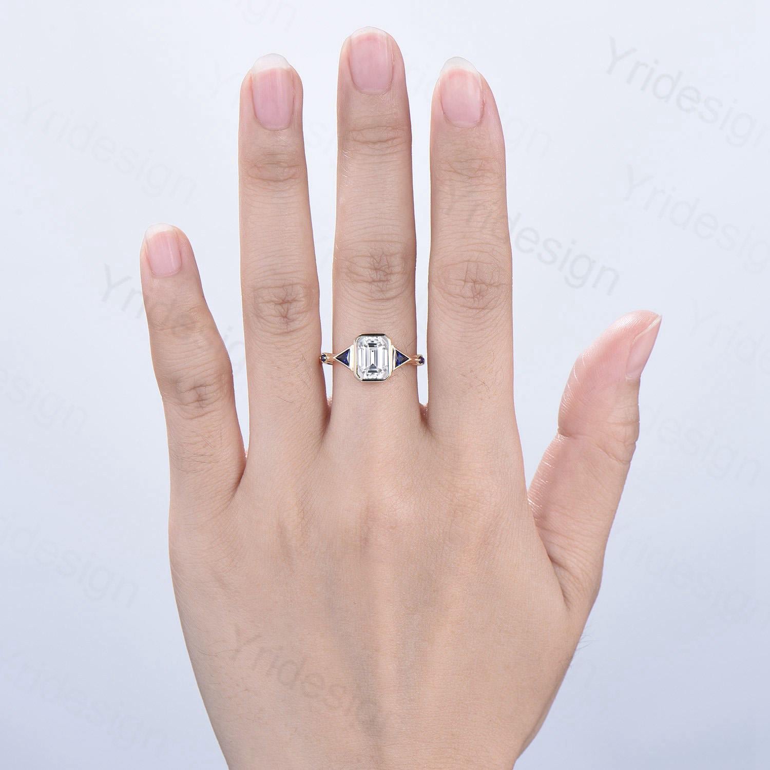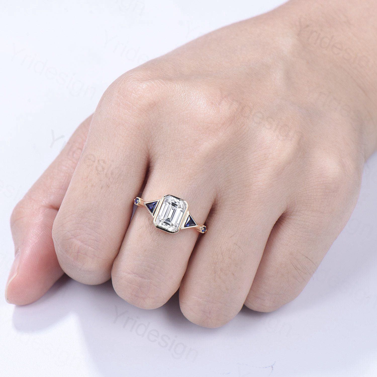 Emerald Cut Moissanite Engagement Ring, Five Stone Trillion Blue Sapphire Accents