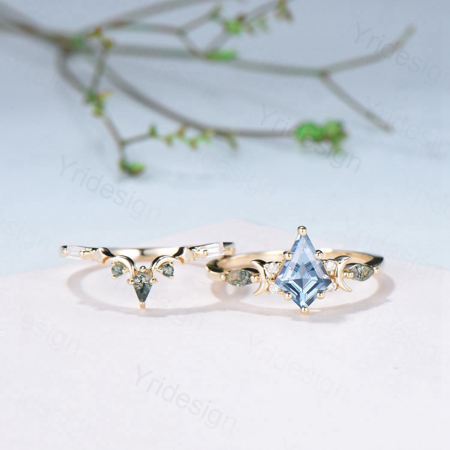 Vintage Kite Cut Natural Aquamarine Engagement Ring Set Yellow Gold Moon Star Cluster Moss Agate Wedding Ring Elegant March Birthstone Ring