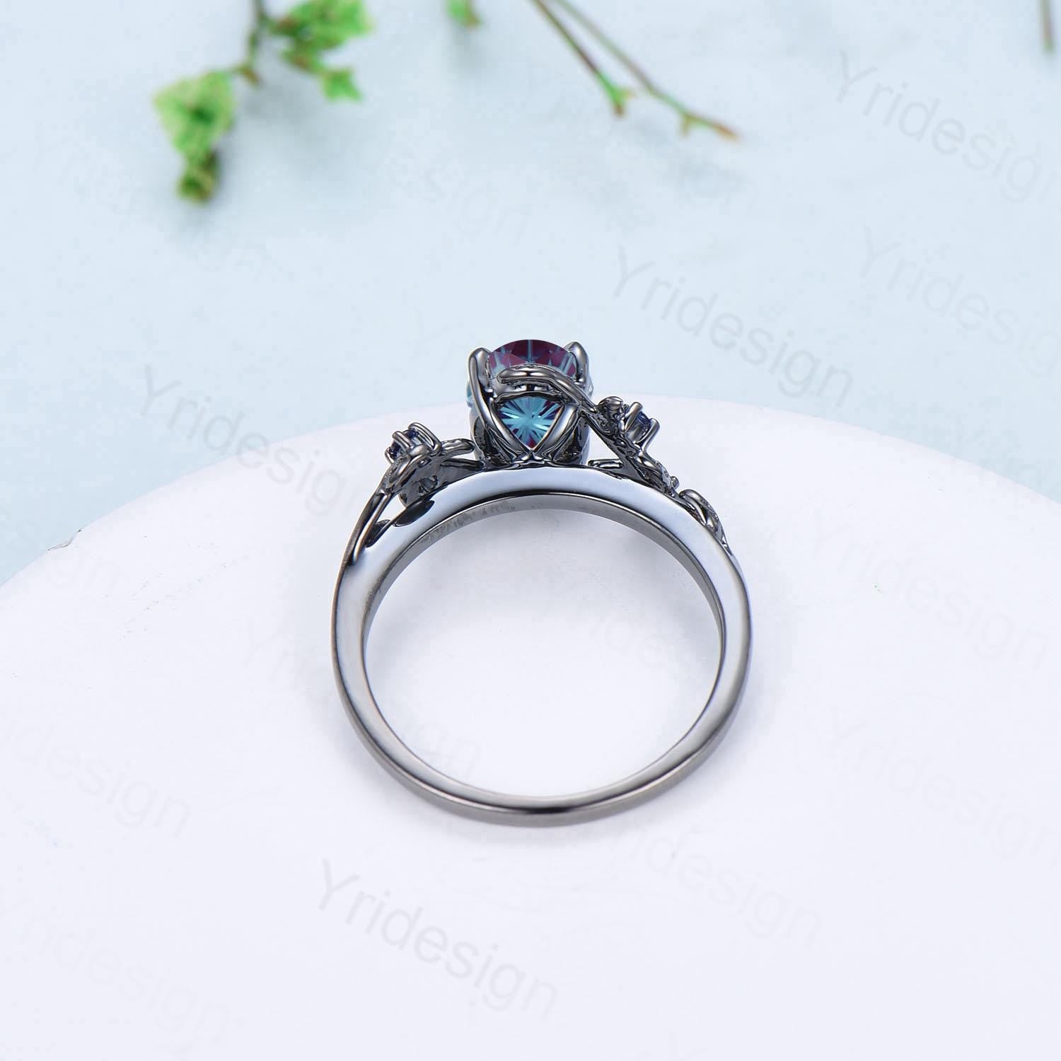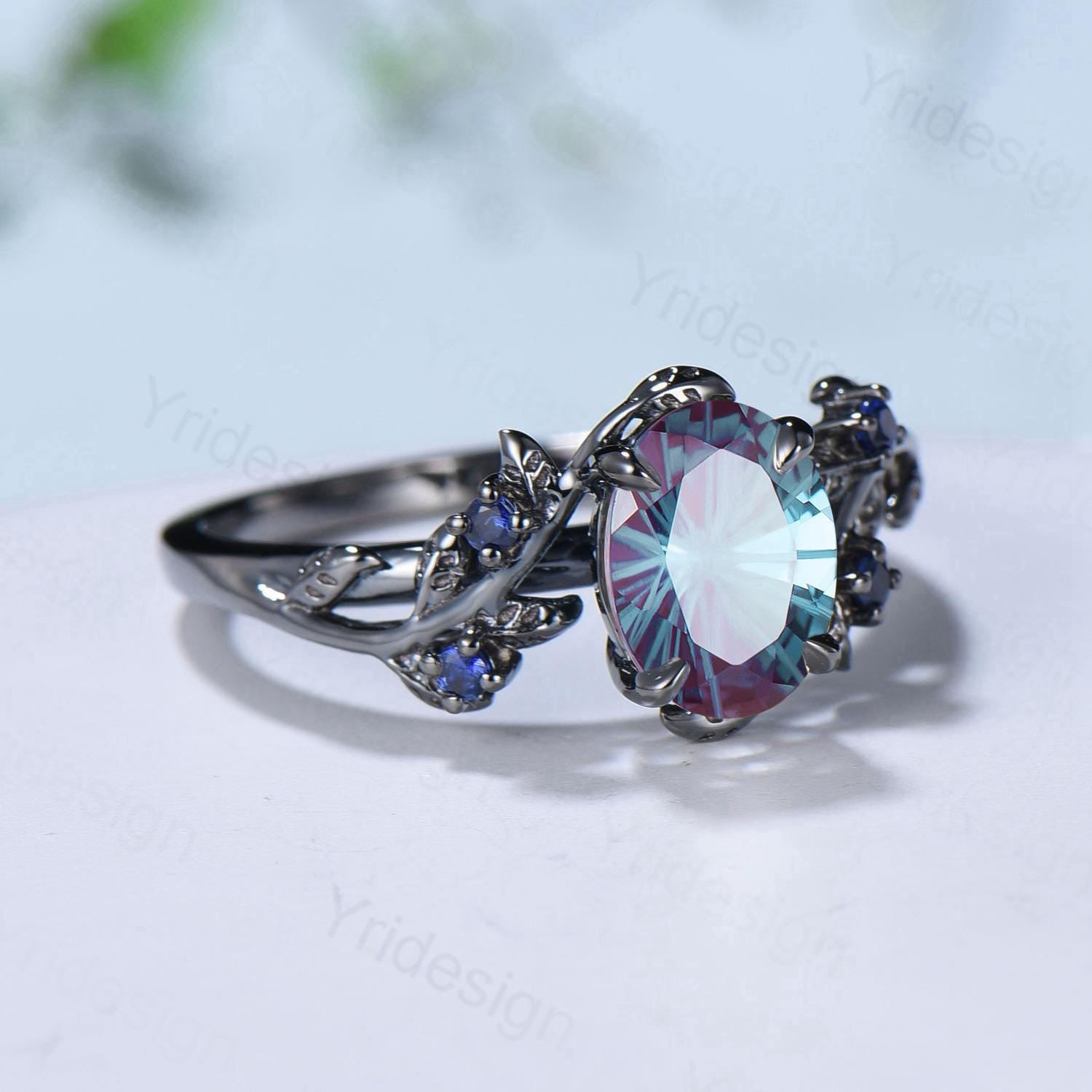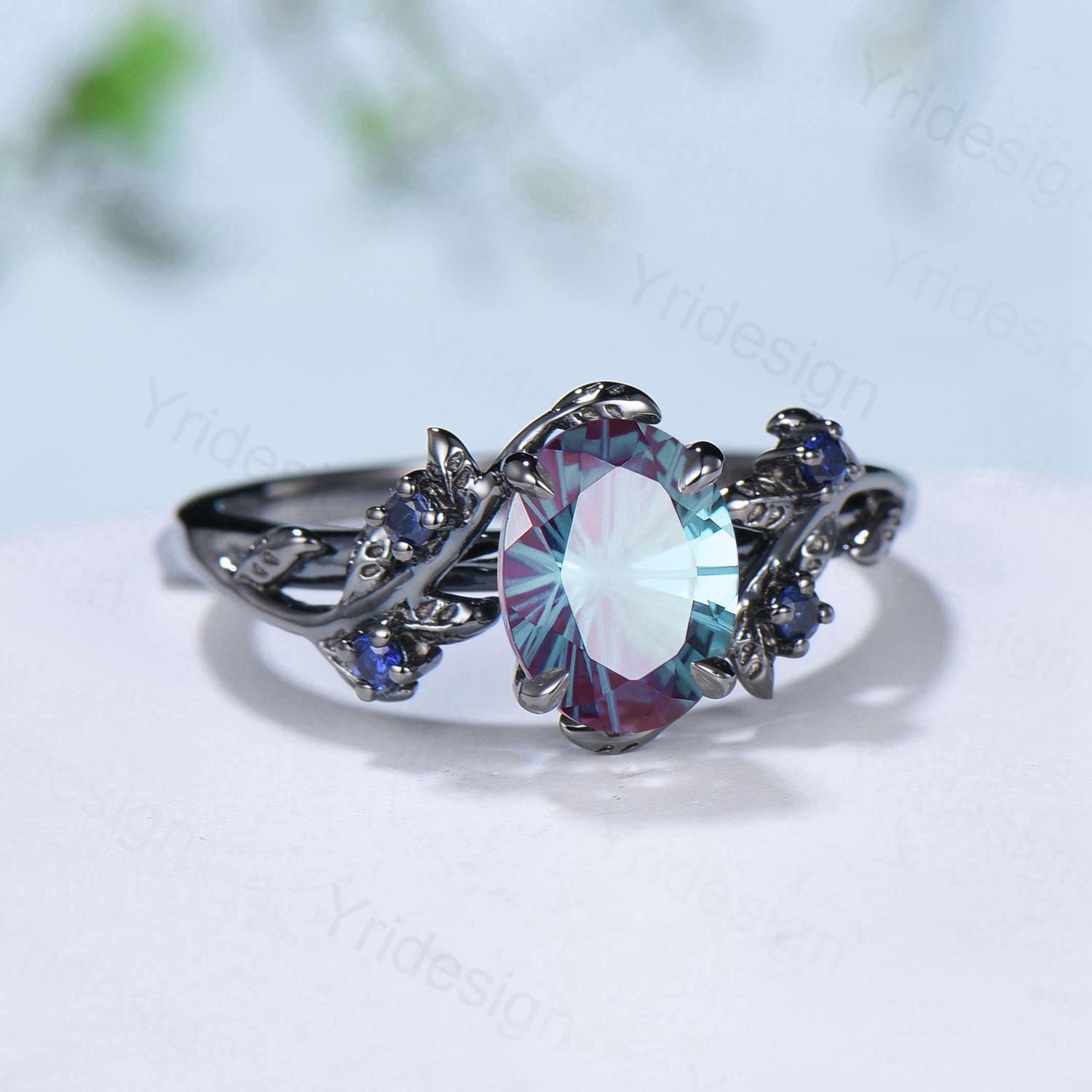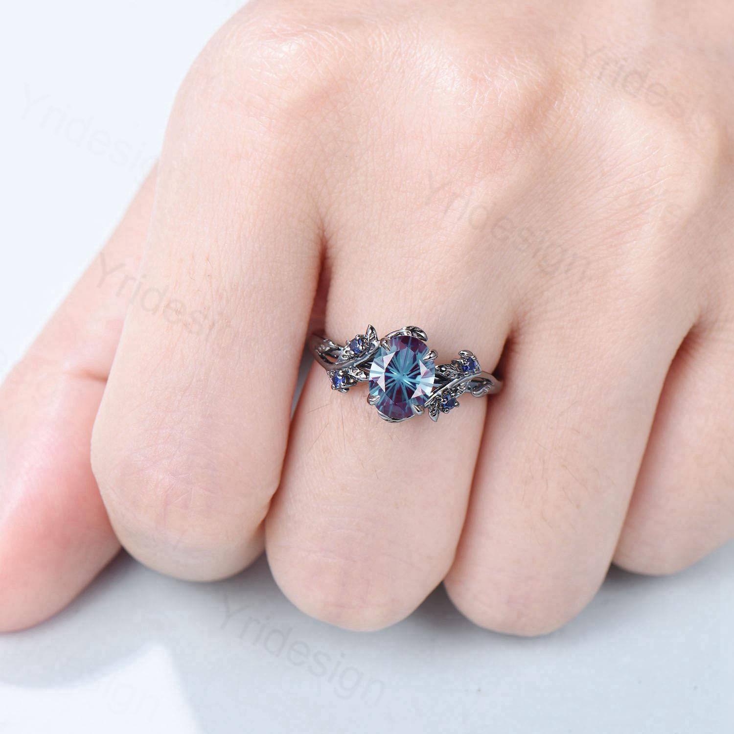Unique Black Gold Fireworks Cut Oval Cut Alexandrite Engagement Ring Nature Inspired Color Changing Leaf Vine Cluster Sapphire Wedding Ring