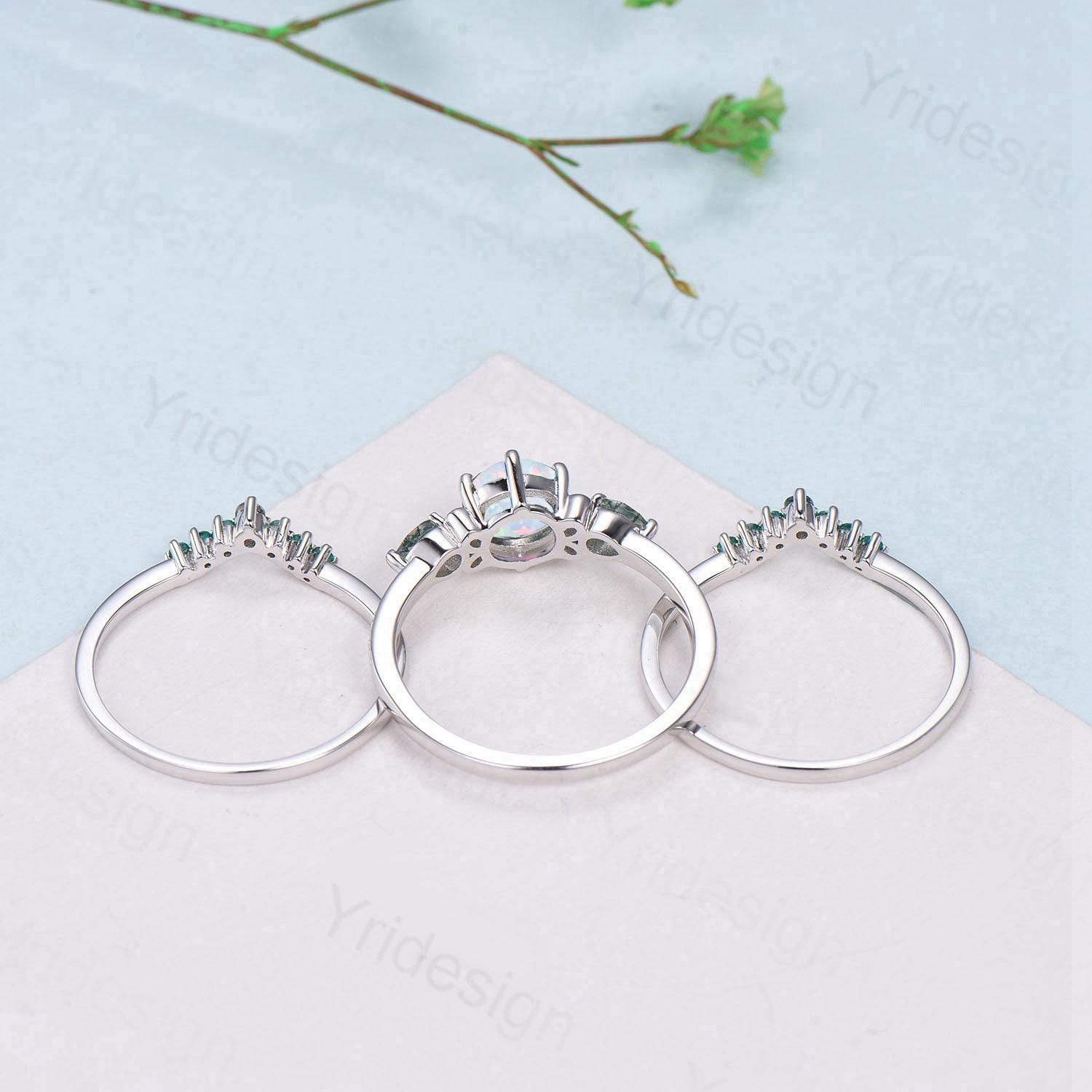 Vintage White Opal Engagement Ring Set, Pear Amethyst Emerald Accent, Milgrain 14K Gold