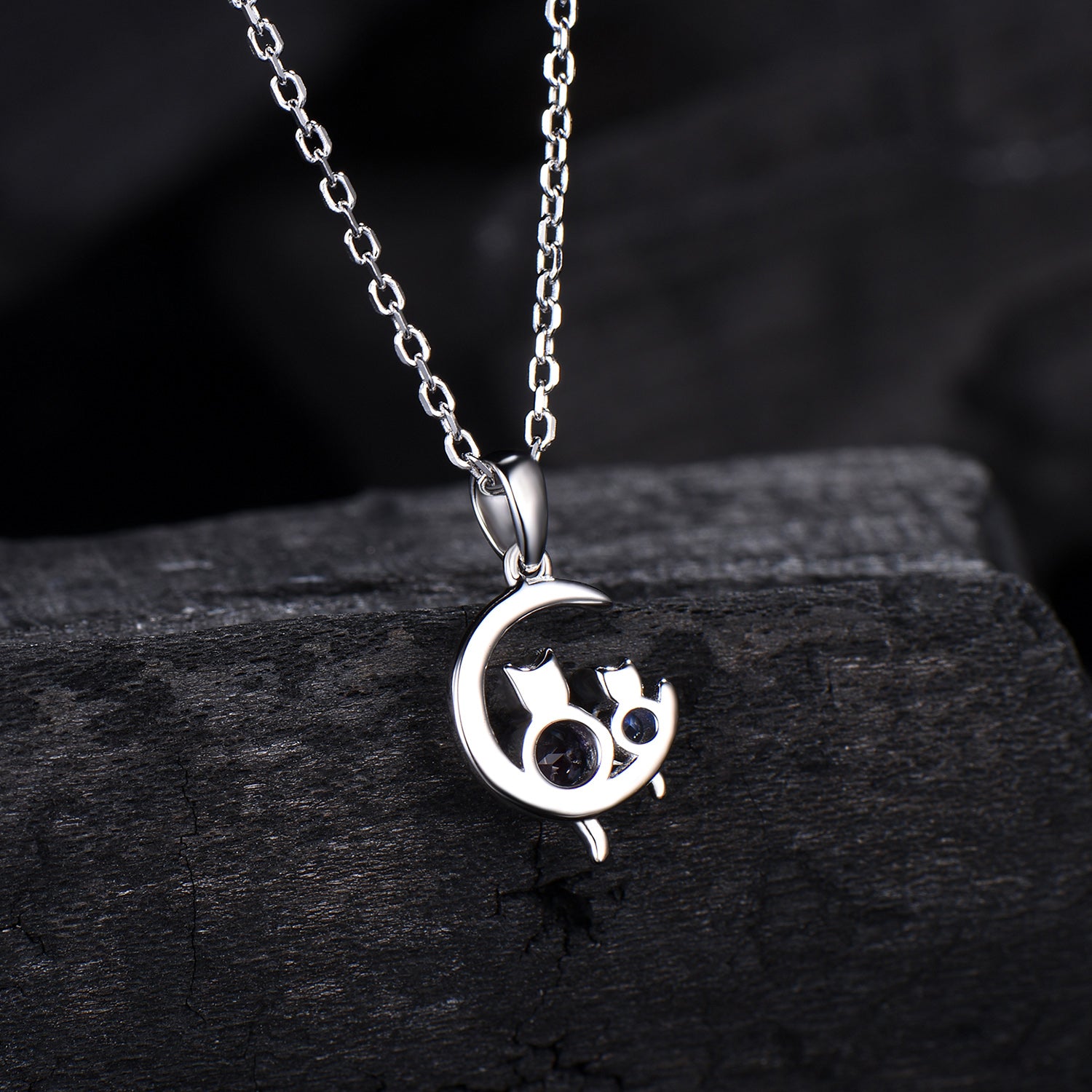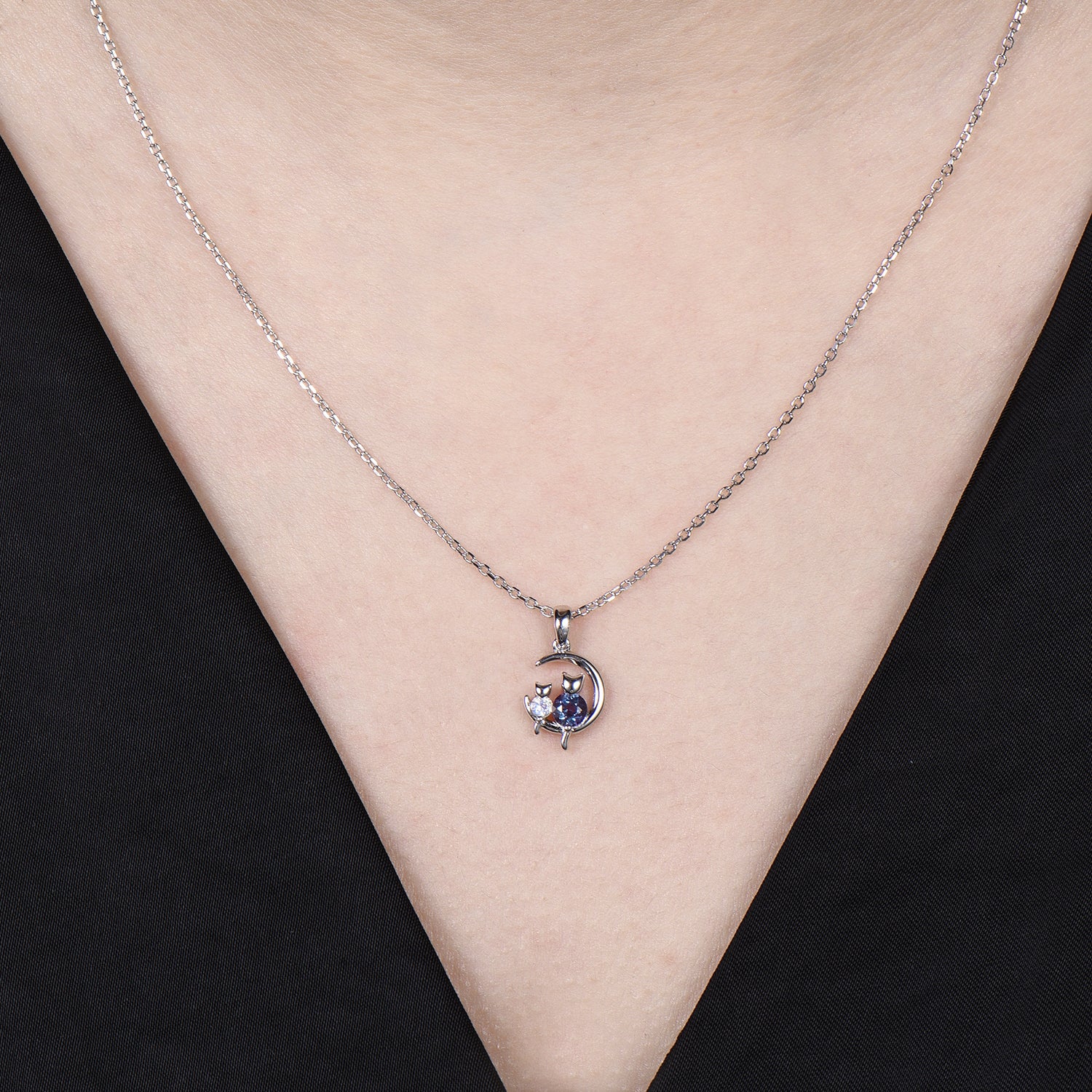 Dainty cat alexandrite moonstone necklace cute silver white gold moon family pendant personalized Two cats lying on the moon rocking chair