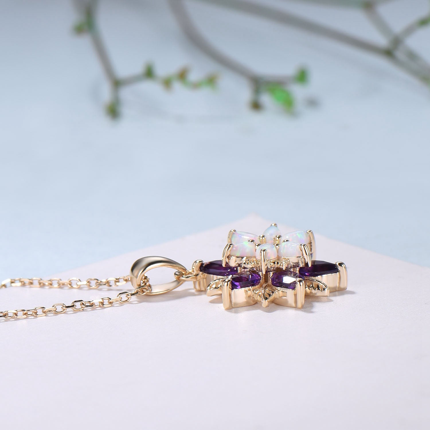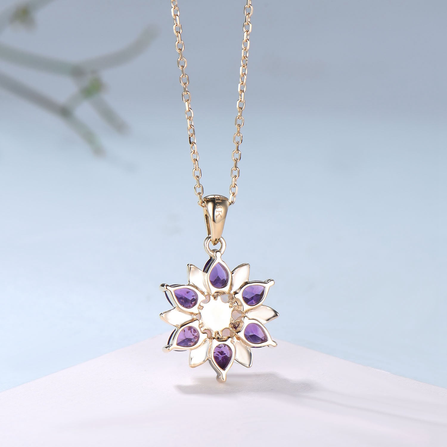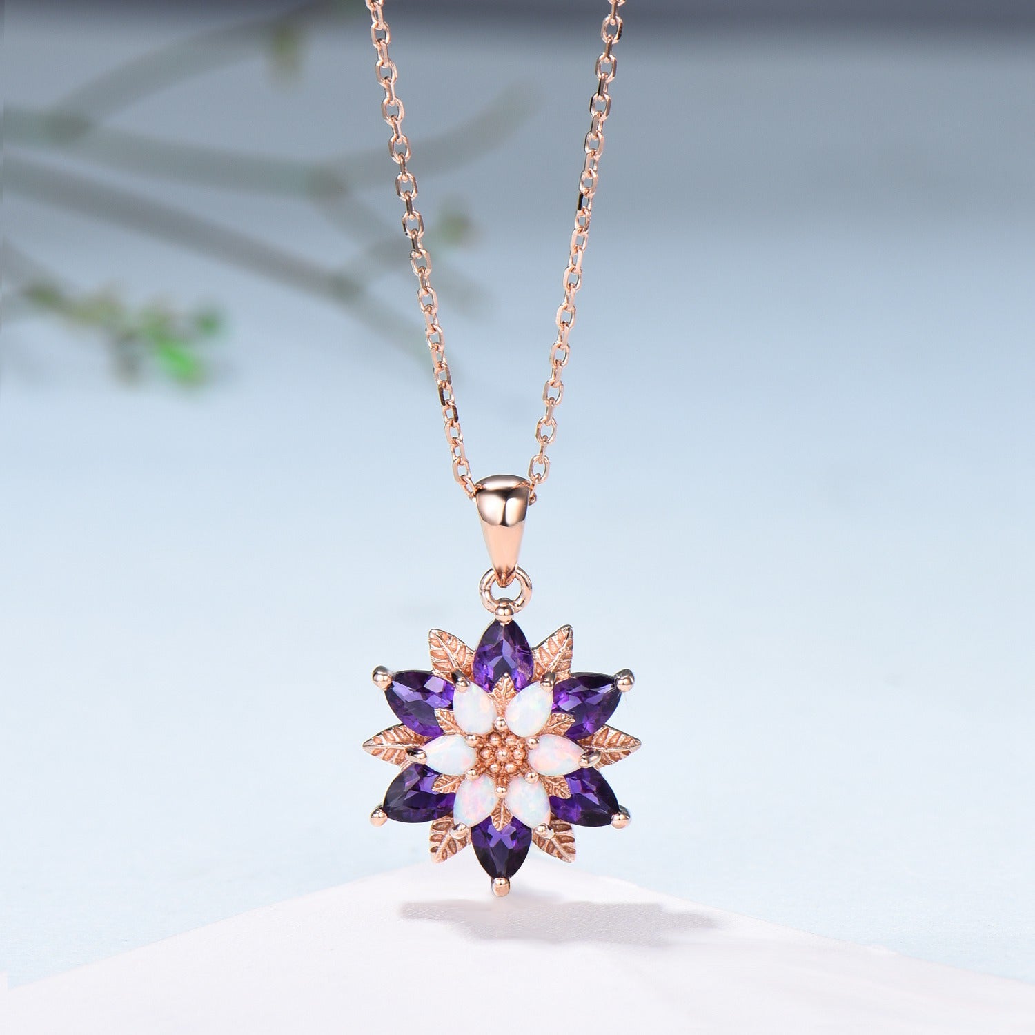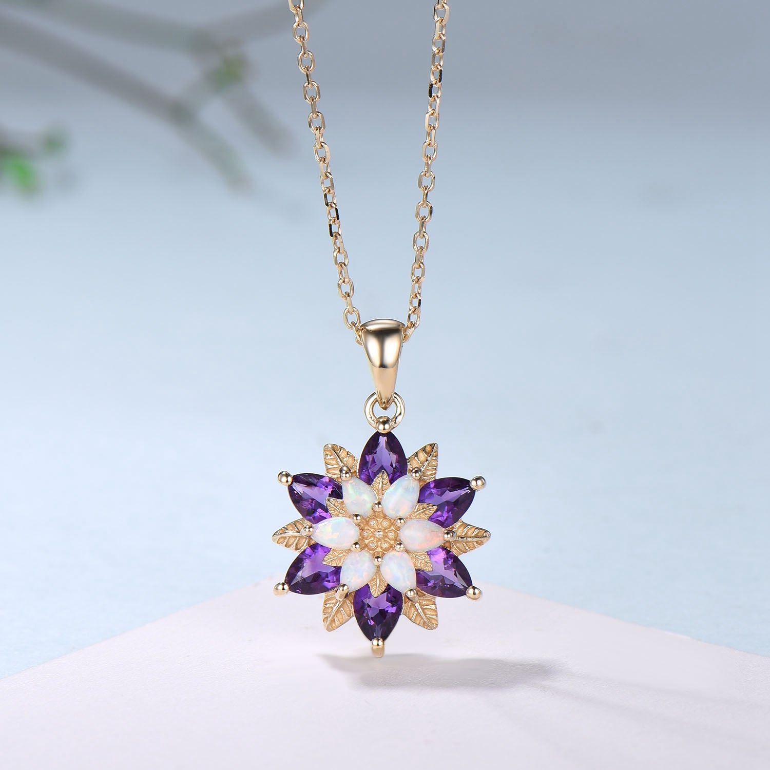Unique Sunflower White Opal Amethyst Necklace Elegant Natural Inspired Double Halo Floral Pendant Leaf Vine Anniversary Promise Gift