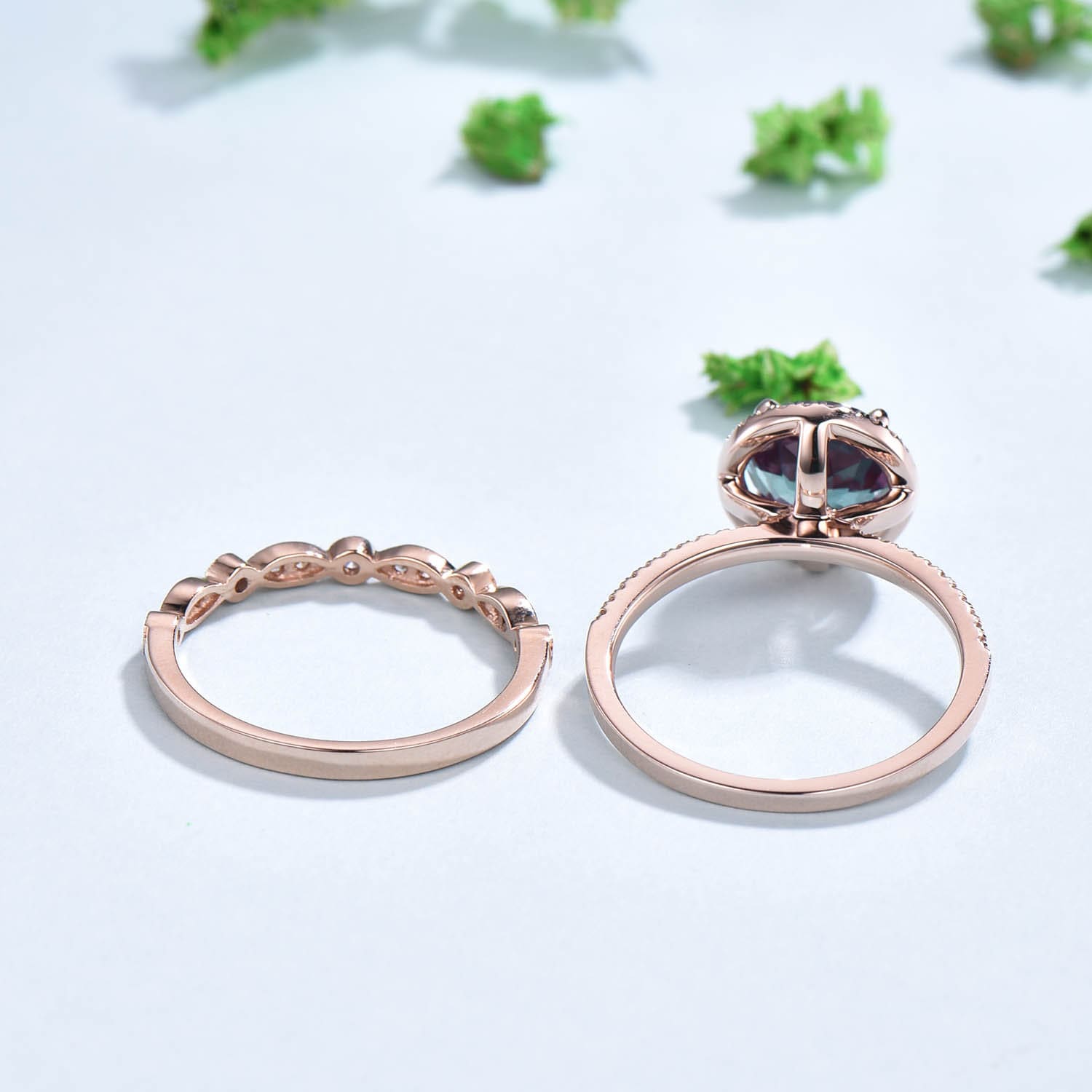 Alexandrite Engagement Ring Set Antique Diamond Halo 2pcs Antique Round cut Bridal ring Art deco Curved Moissanite Marquise Diamond Milgrain