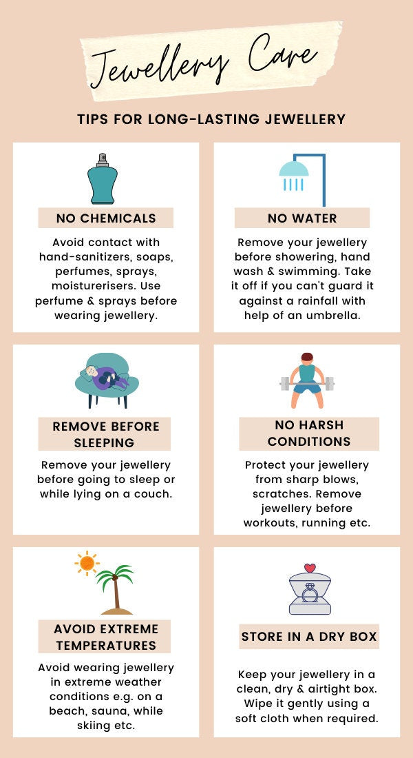- Remove Jewelry During Activities: Take off jewelry when swimming, exercising, or doing household chores to avoid damage from chemicals, impact, or sweat.