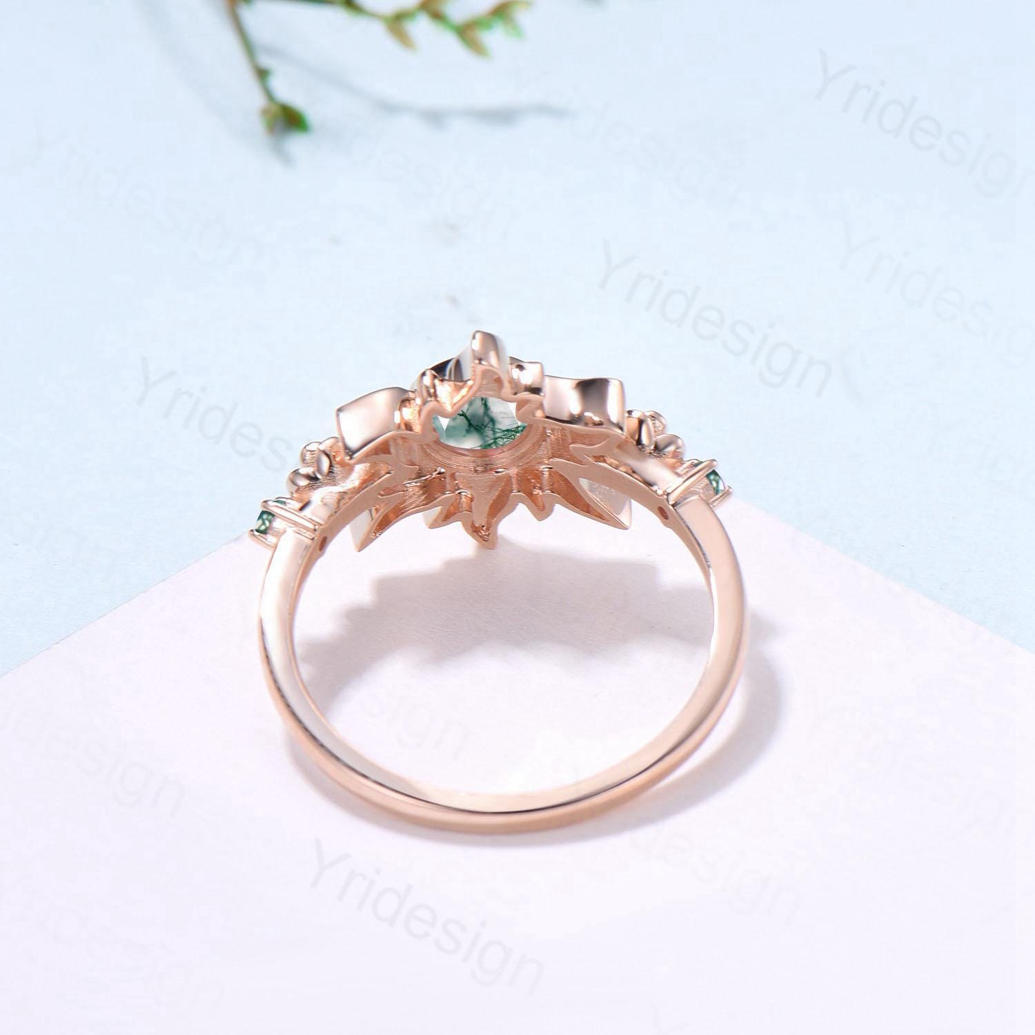 Unique Sunflower Moss Agate Engagement Ring 14K Rose Gold Garden Floral Tiny Rose Accents Nature Inspired Floral Anniversary Ring for Women