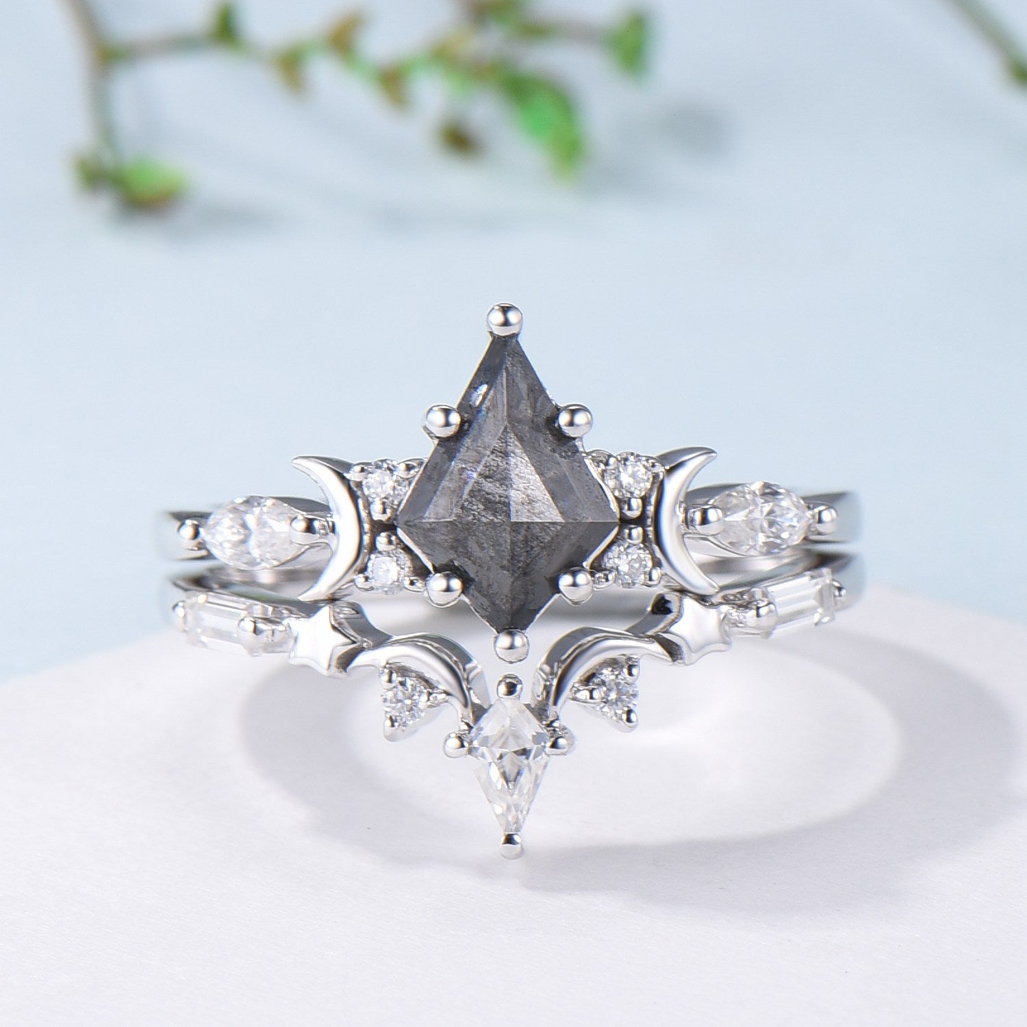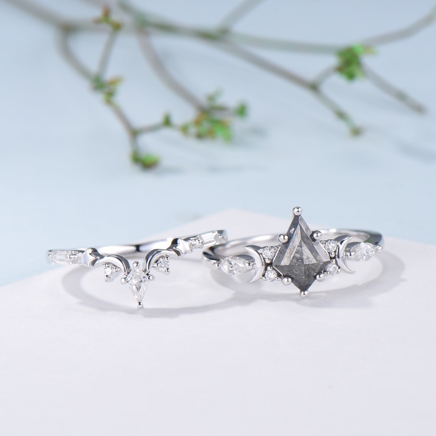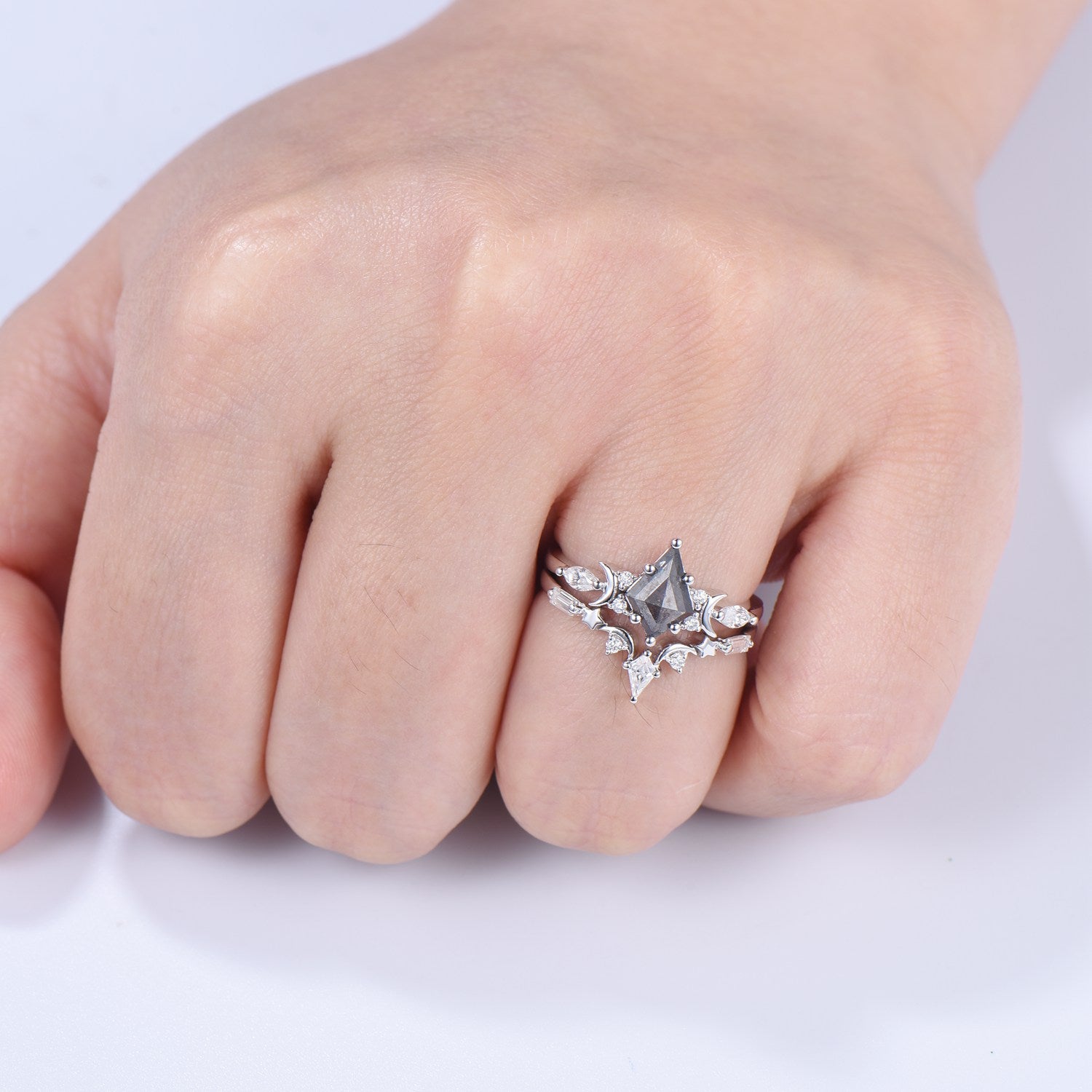 Unique kite cut salt and pepper diamond ring set natural pepper engagement ring 18k white gold bridal wedding set handmade anniversary gift