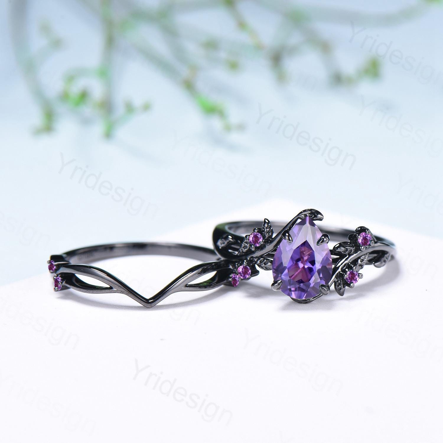 Black Gold Purple Sapphire Bridal Ring Set, Vintage Leaf Amethyst Wedding Rings