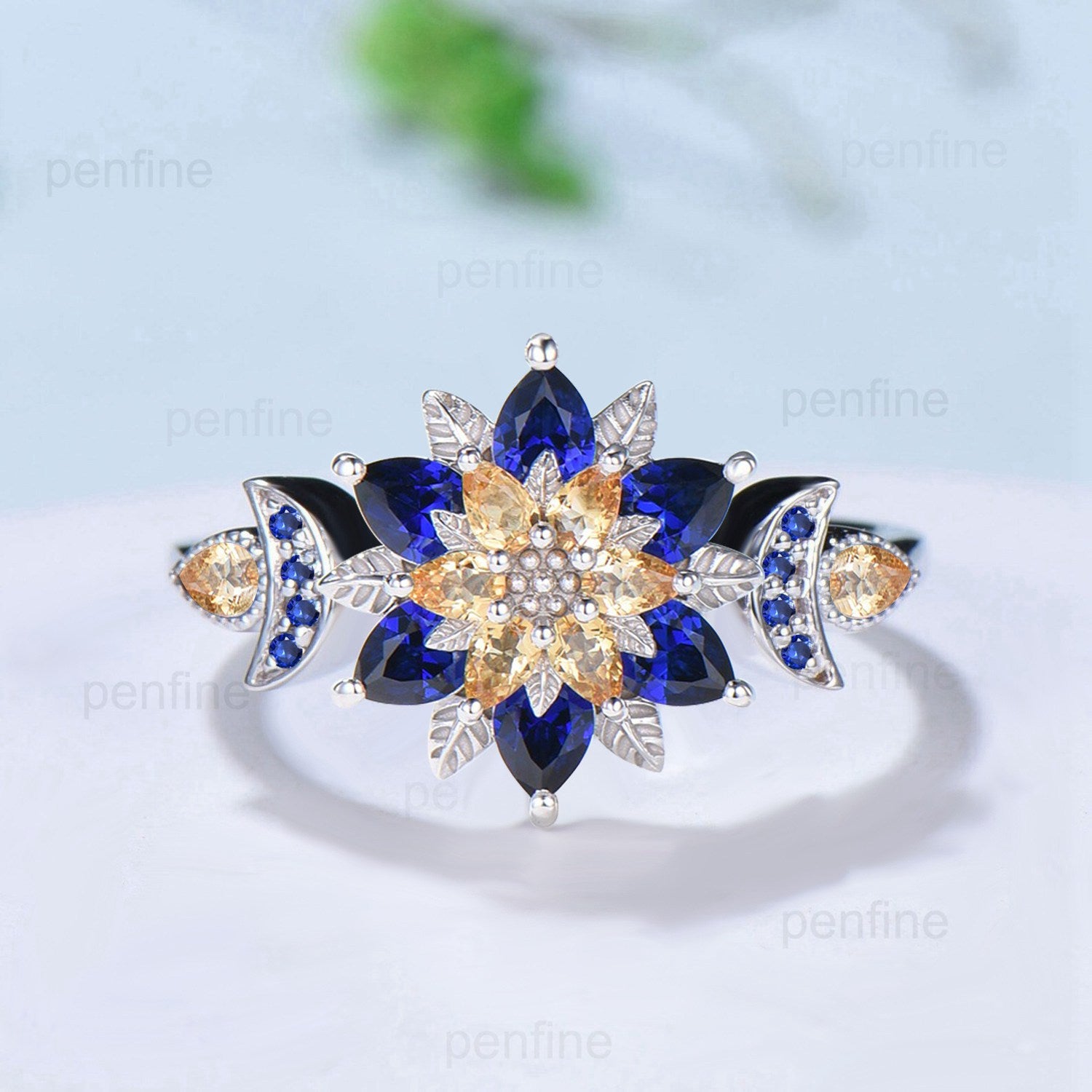 Celestial Sun and Moon Engagement Ring | Sapphire & Citrine Floral Mandala