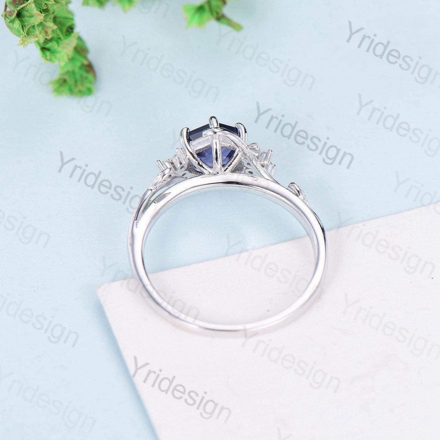 Hexagon Cut Lab Purple Sapphire Ring - Nature Inspired Leaf Vine Band