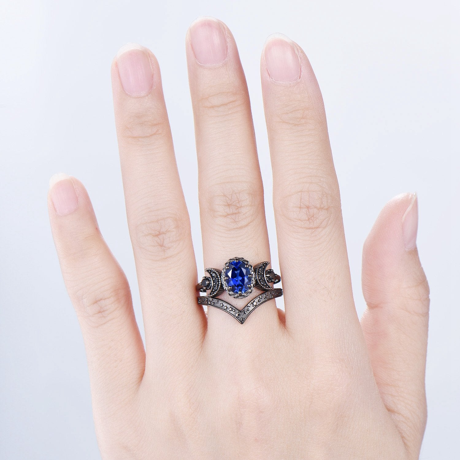 Unique moon star ring Oval blue sapphire wedding ring set Black gold gothic engagement ring set crescent moon sapphire bridal set for women