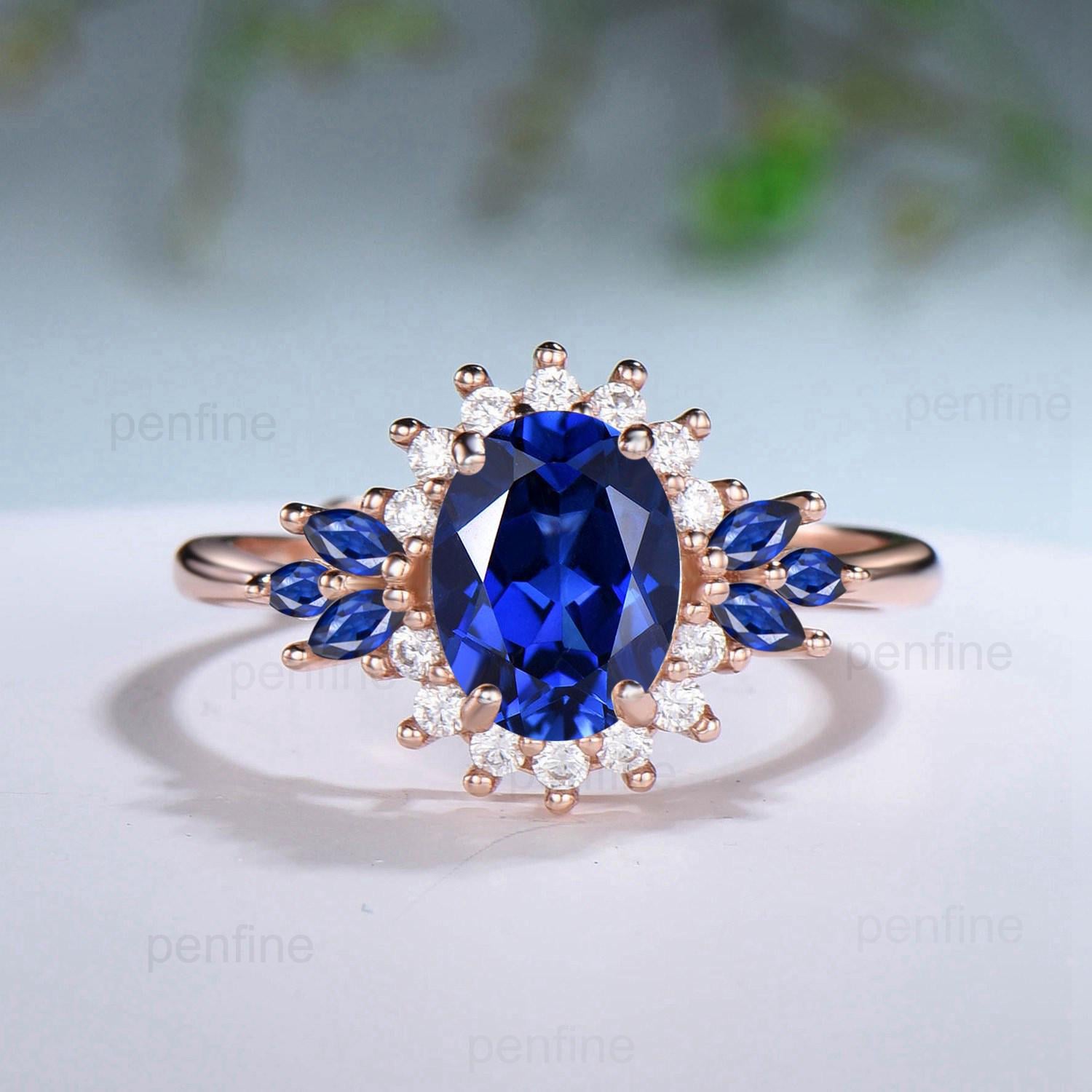 Vintage Oval Cut Blue Sapphire Engagement Ring Set Unique June Birthstone Promise Ring Cluster Moissanite Ring Handmade Wedding Bridal Sets