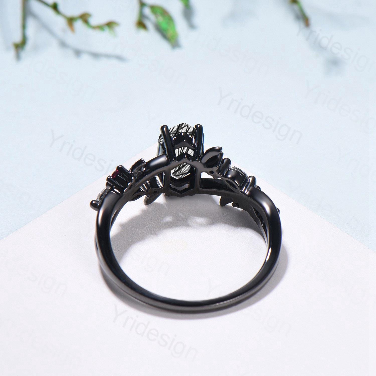 Art Deco Long Hexagon Cut Black Rutilated Quartz Engagement Ring Black Gold Gothic Engagement Ring Leaf Vine Black Spinel Moissanite Band