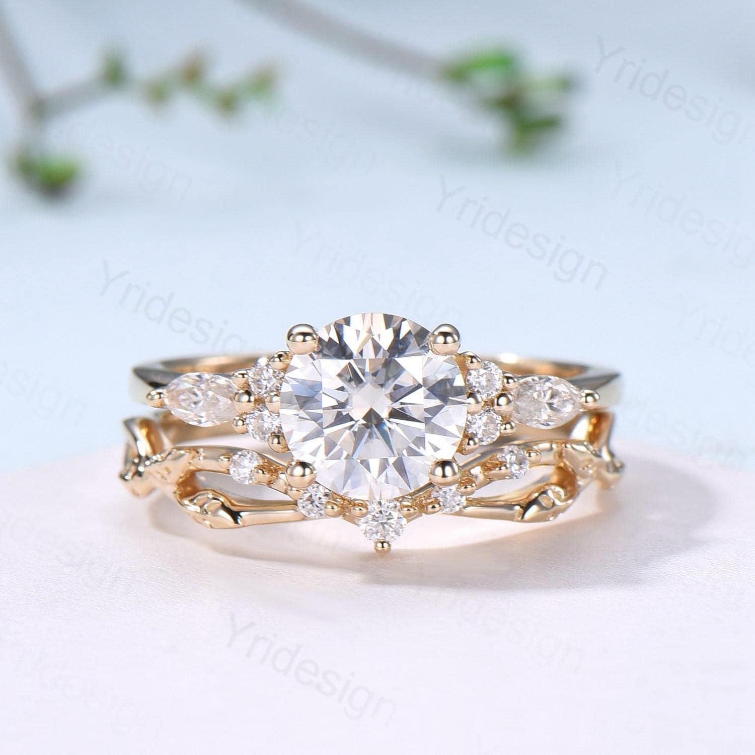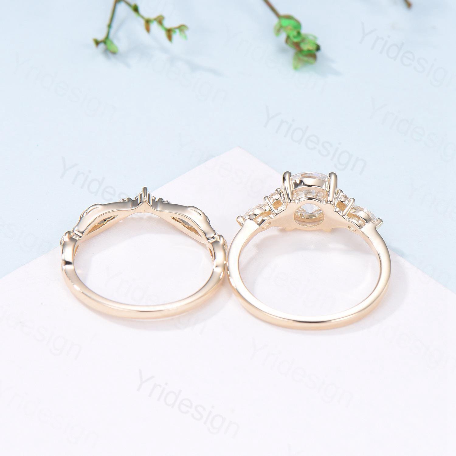 Vintage Round Cut Moissanite Engagement Ring Set 14K Yellow Gold Lab Grown Diamond Bridal Ring Set 2pcs Anniversary Promise Ring Set Women