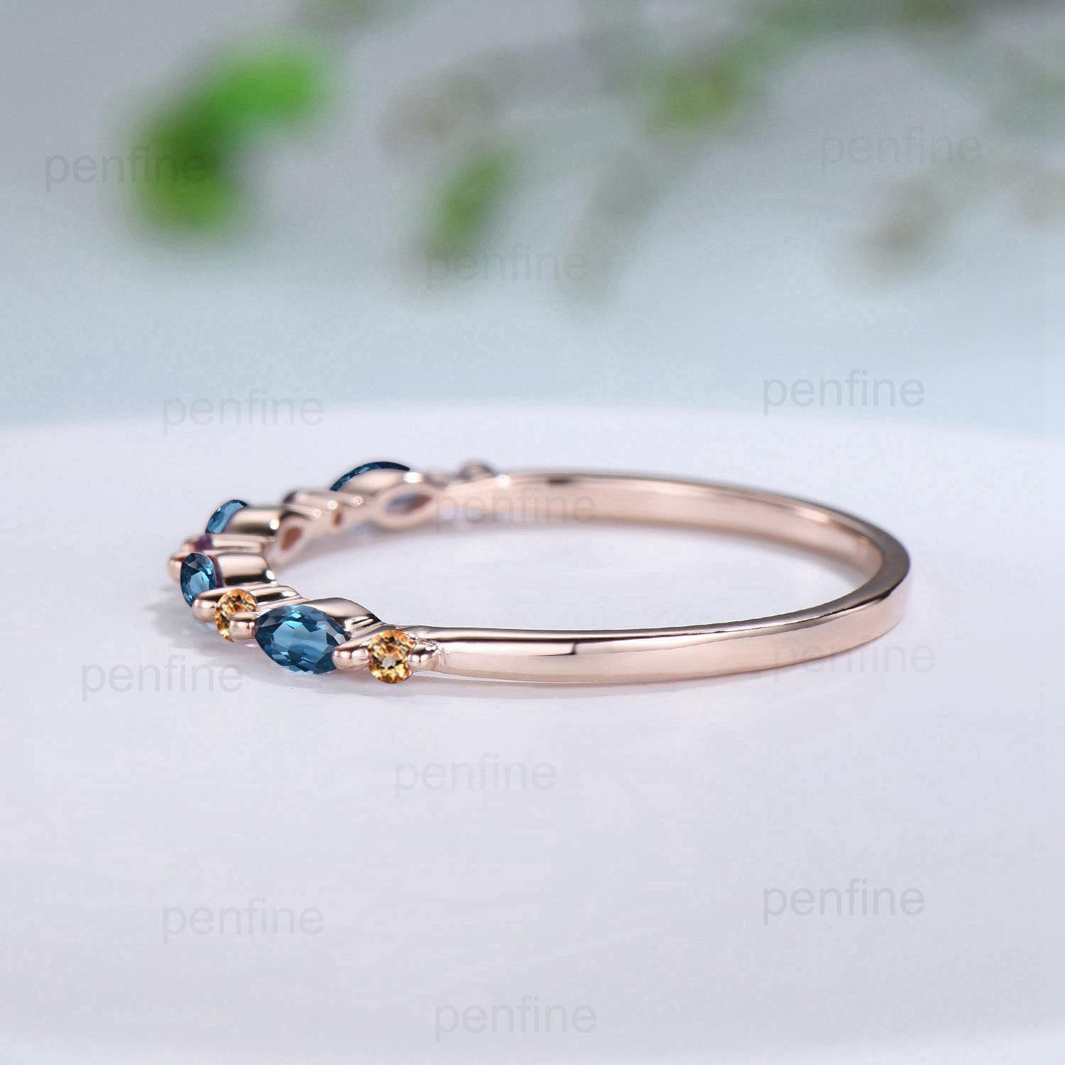 Rose Gold London Blue Topaz & Citrine Stacking Ring, Dainty Marquise Gemstone Eternity Band, Unique Art Deco Inspired Statement Jewelry