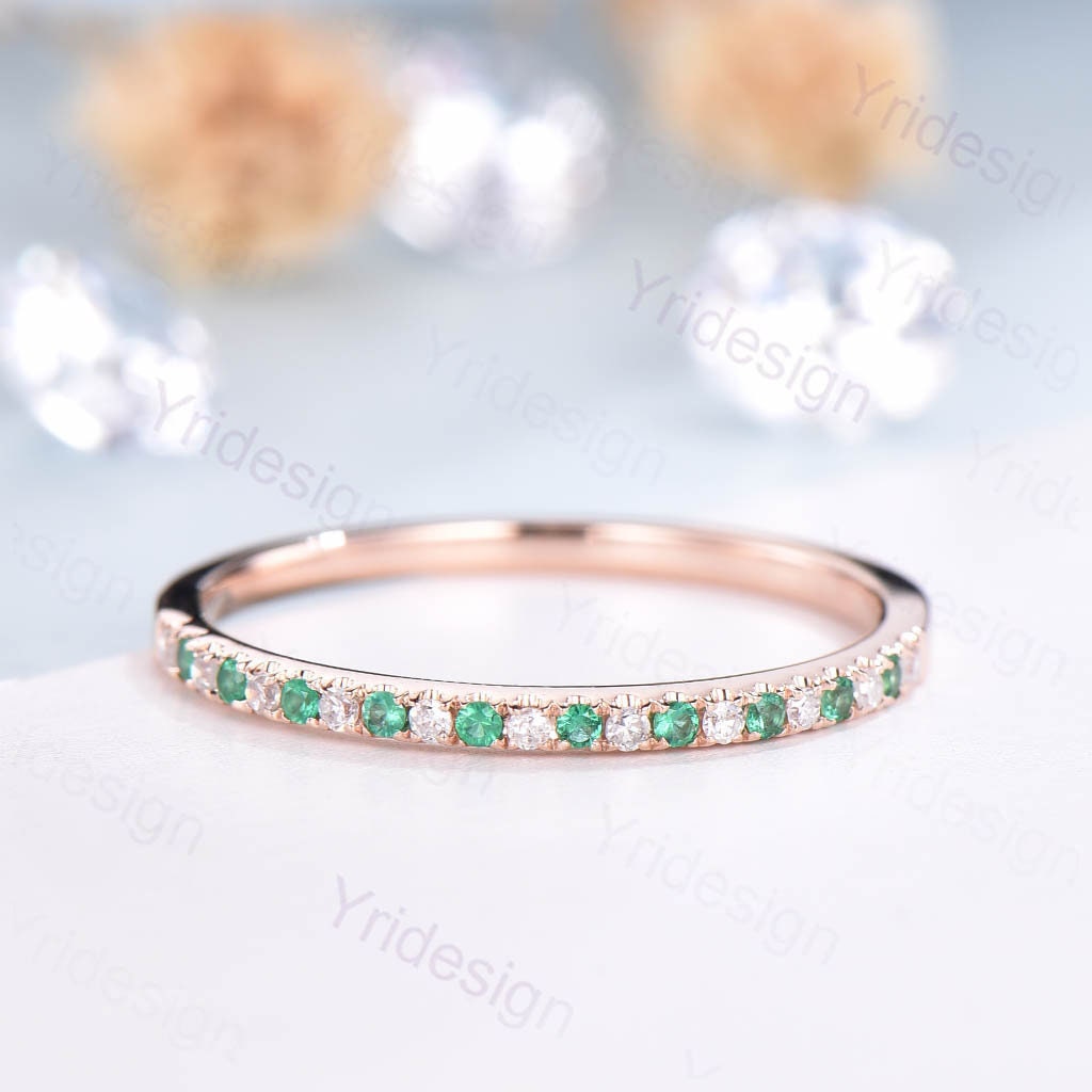Dainty 14k Rose Gold Emerald Diamond Wedding Band