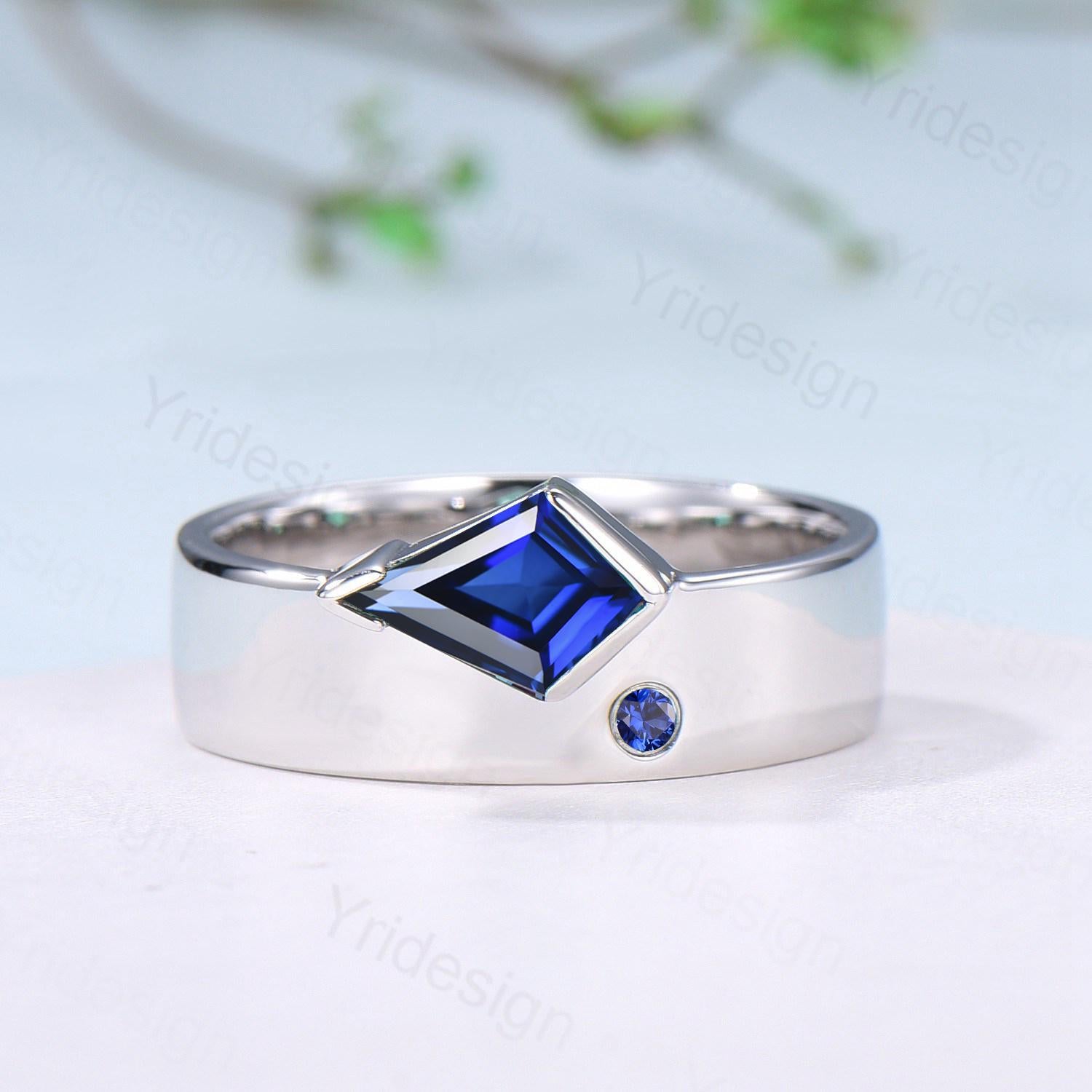 One Of a Kind Sapphire Wedding Band For Men Unique Kite Cut Blue Sapphire Men's Wedding Ring Retro 6mm Stacking Anniversary Matching Band